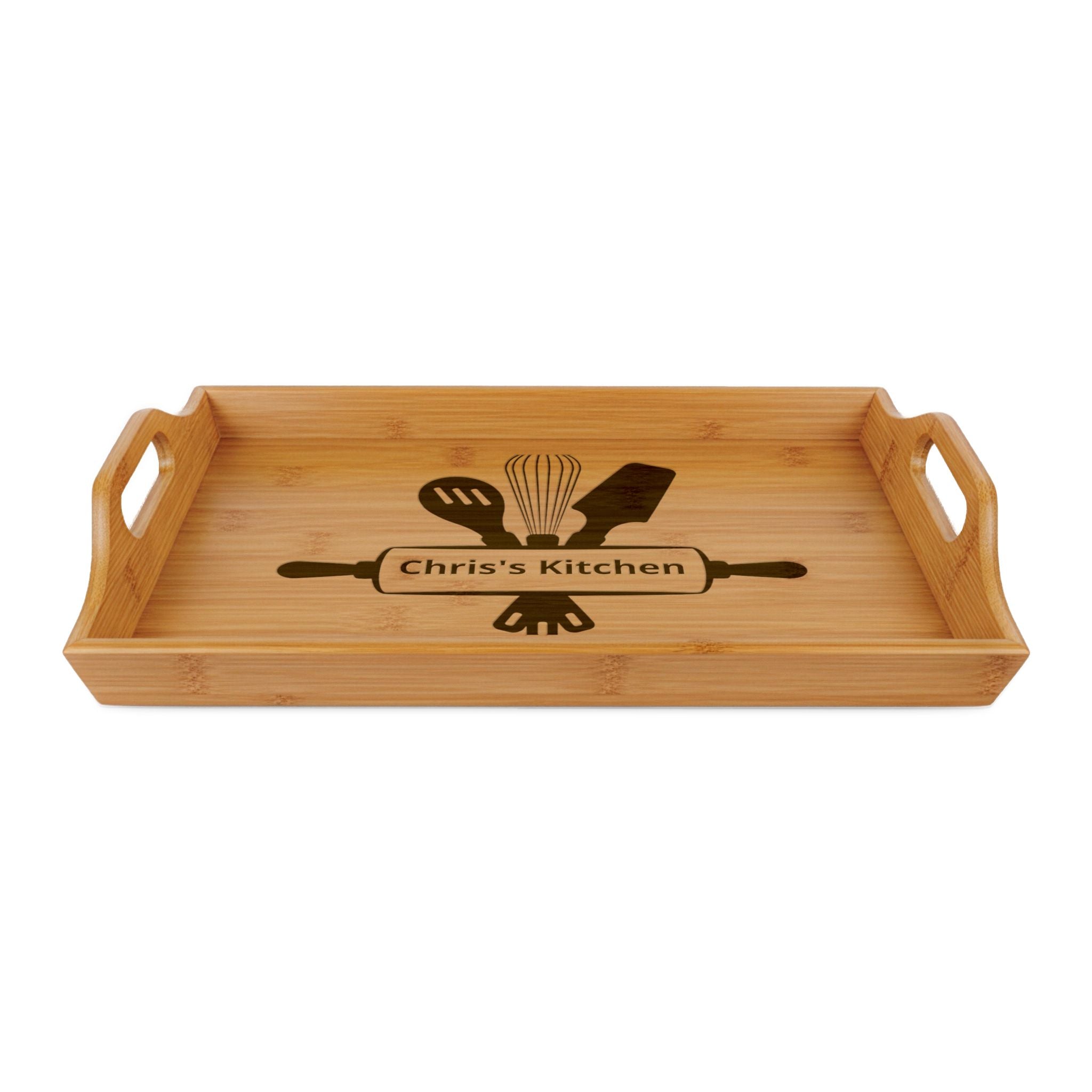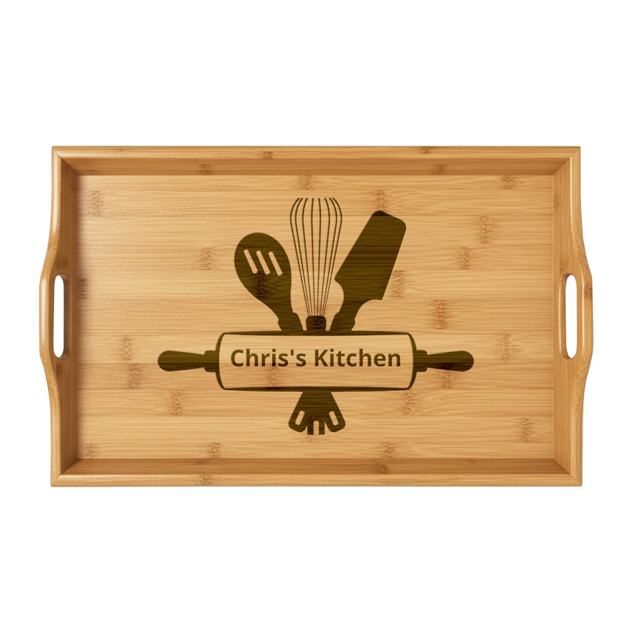 Warm, tactile, and quietly personal — this engraved bamboo serving tray brings simple beauty to everyday meals and kitchen moments. Smooth, naturally grained bamboo frames an engraved rolling pin and utensils motif that reads like a small, handmade sign: a subtle celebration of home cooking and hands-on hospitality. Lightweight but sturdy, it carries breakfast to the table, gathers appetizers on a casual evening with friends, or holds a teapot and mugs for a slow morning. The engraving adds character without shouting, so the tray feels lived-in from the first use and blends with rustic, modern, or farmhouse kitchens.