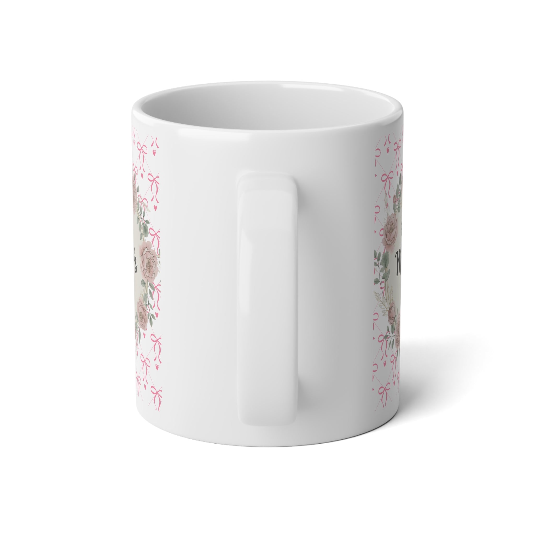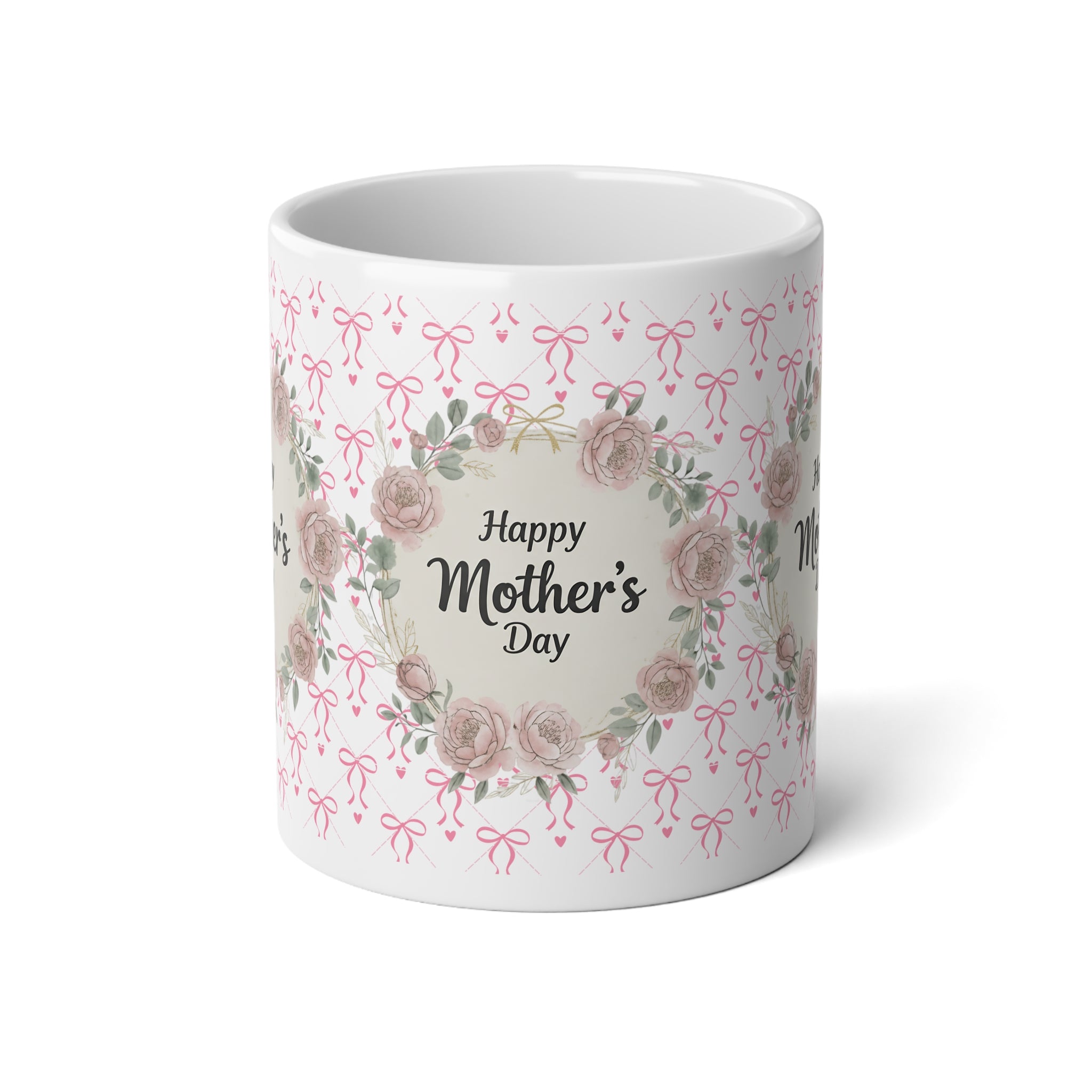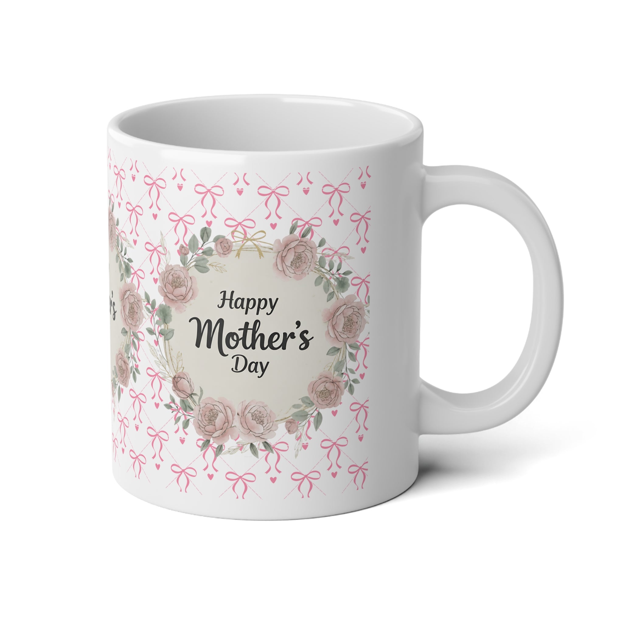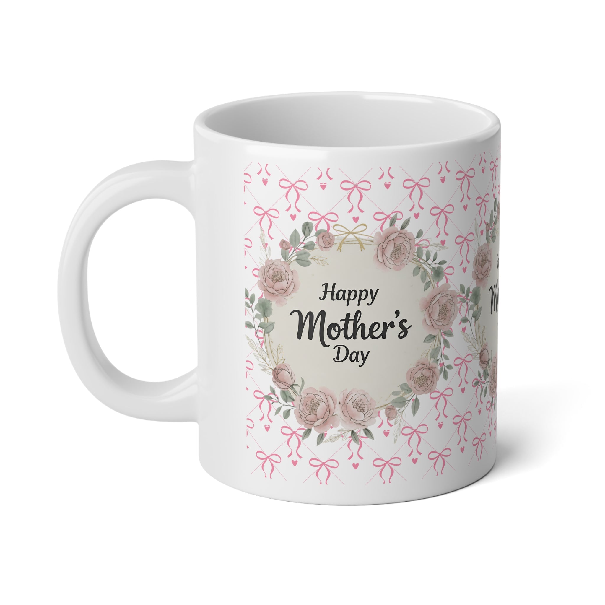 This 20oz jumbo ceramic mug wraps morning coffee in a gentle, floral embrace. Soft pink bows and watercolor roses circle a warm “Happy Mother’s Day” message, creating a calm, tender moment with every sip. The glossy finish and crisp, vibrant print keep the wreath and lettering clear and luminous — a small, everyday ritual that reads like a handwritten note. Sturdy C-handle and large capacity make it easy to hold and savor longer pours of tea, cocoa, or coffee during slow mornings, porch chats, or quiet afternoons spent together.