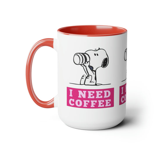 Snoopy- I need Coffee Two-Tone Coffee Mugs, 15oz
