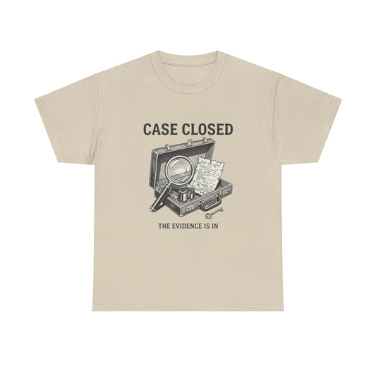 • Printed Unisex Heavy Cotton Tee with 'Case Closed' Design, Detective Gift, Casual Wear, Crime Scene Shirt, Novelty Tee