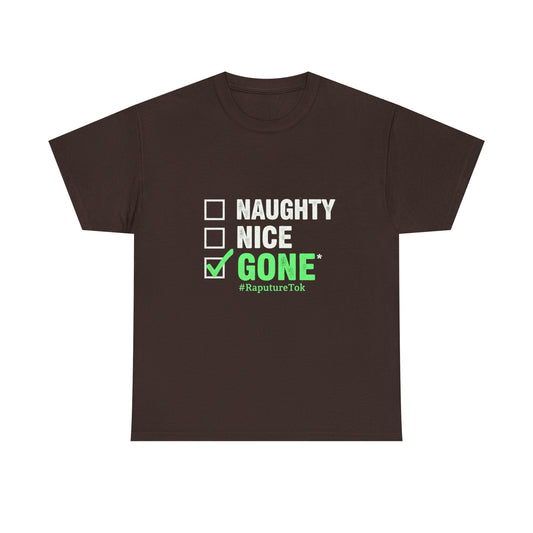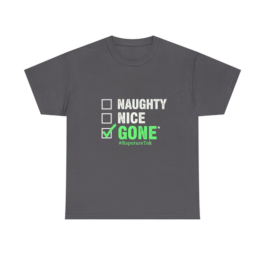 Unisex Heavy Cotton Tee - "Naughty, Nice, Gone" | Funny Holiday Shirt | Casual Wear for Christmas & Parties, Gift for Friends, Humorous Tee