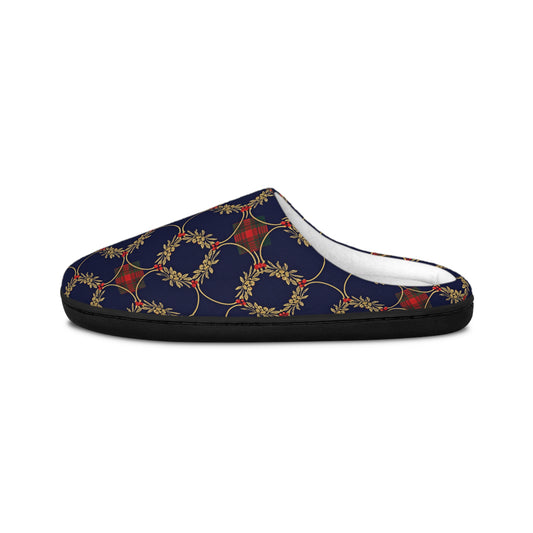 Men's Plaid Wreath Indoor Slippers — Cozy Navy Holiday House Shoes