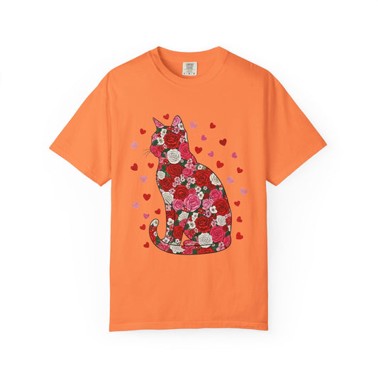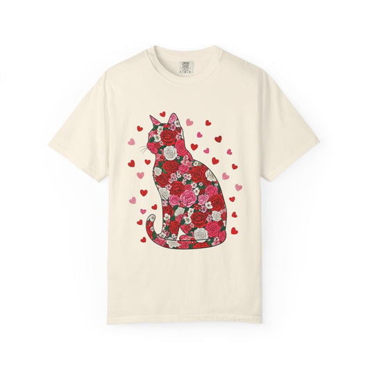 • Floral Cat Silhouette T‑Shirt — Heart Pattern Valentine’s Tee for Cat Lovers