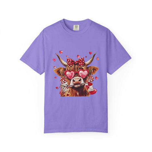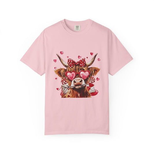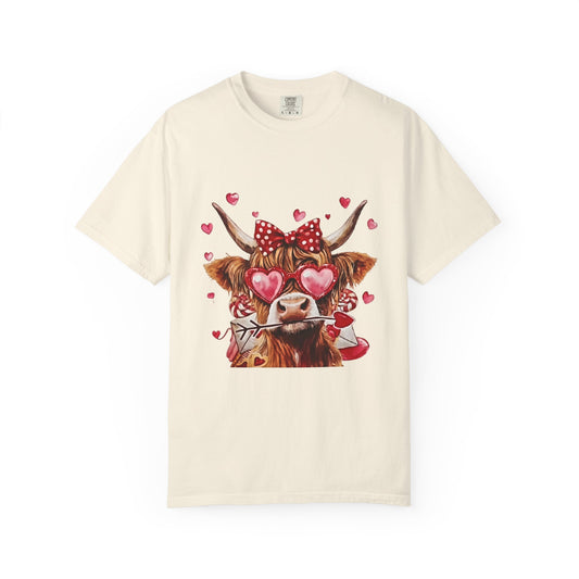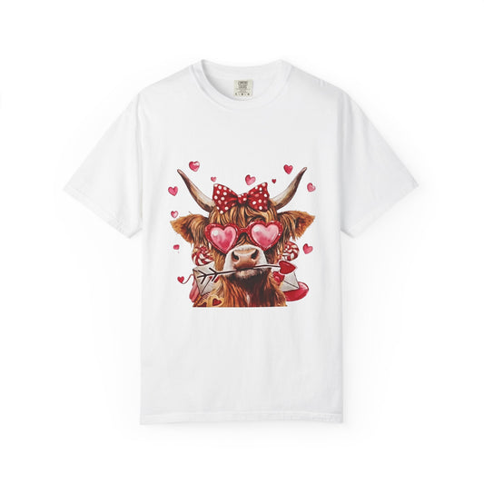 • Valentine Highland Cow T-Shirt — Cute Cow with Hearts & Rose
