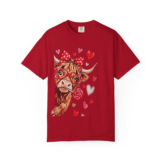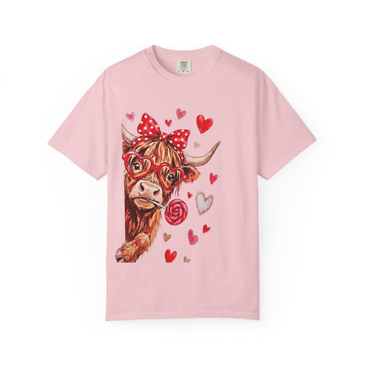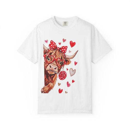 Valentine Highland Cow T-Shirt — Cute Cow with Hearts & Rose