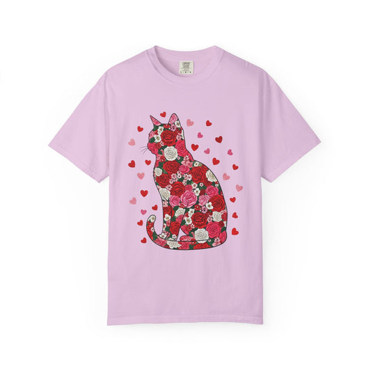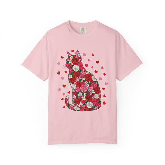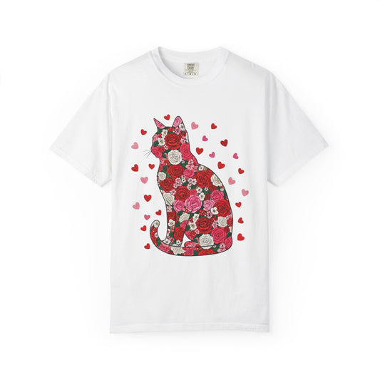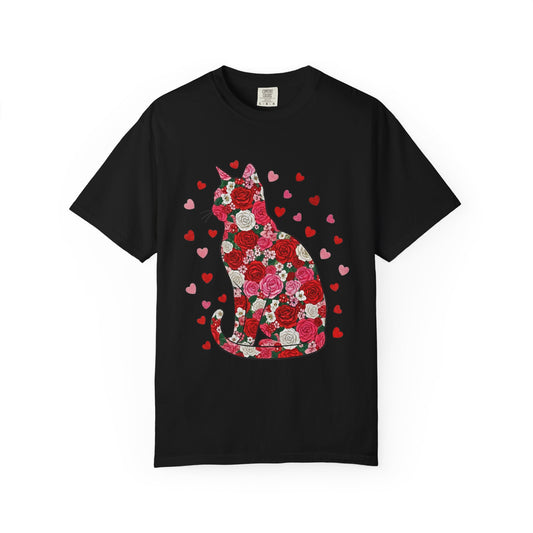 Floral Cat Silhouette T‑Shirt — Heart Pattern Valentine’s Tee for Cat Lovers