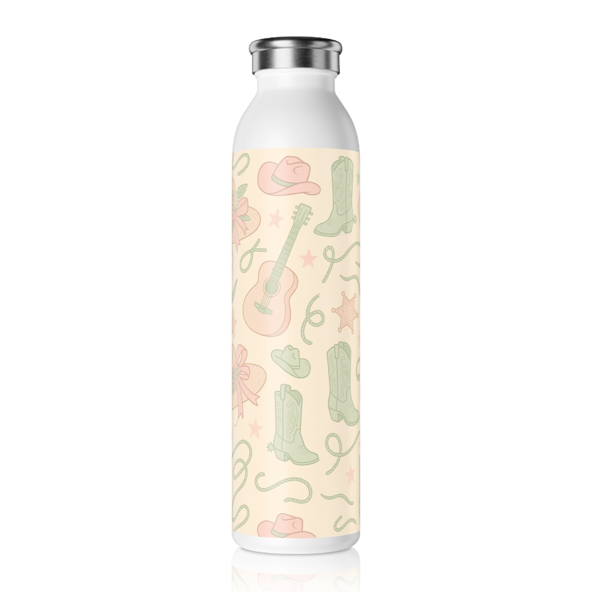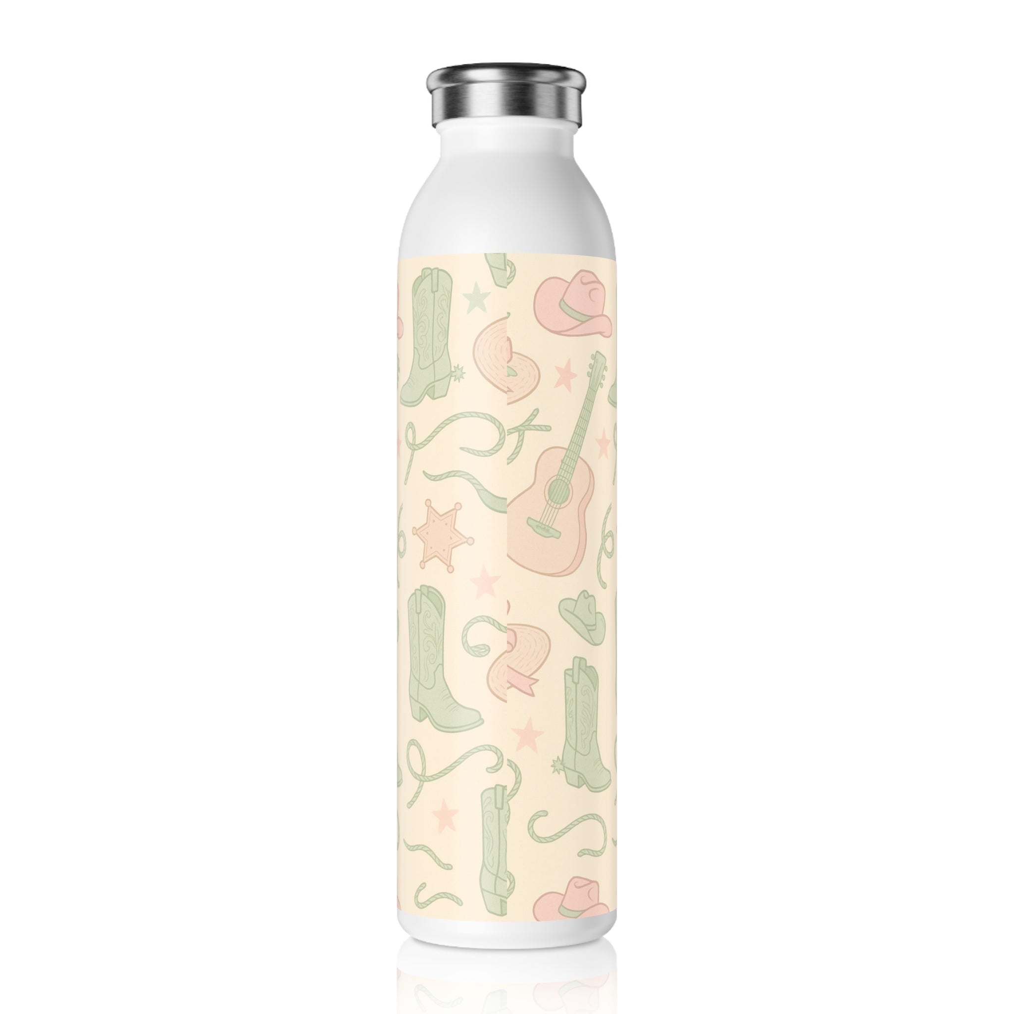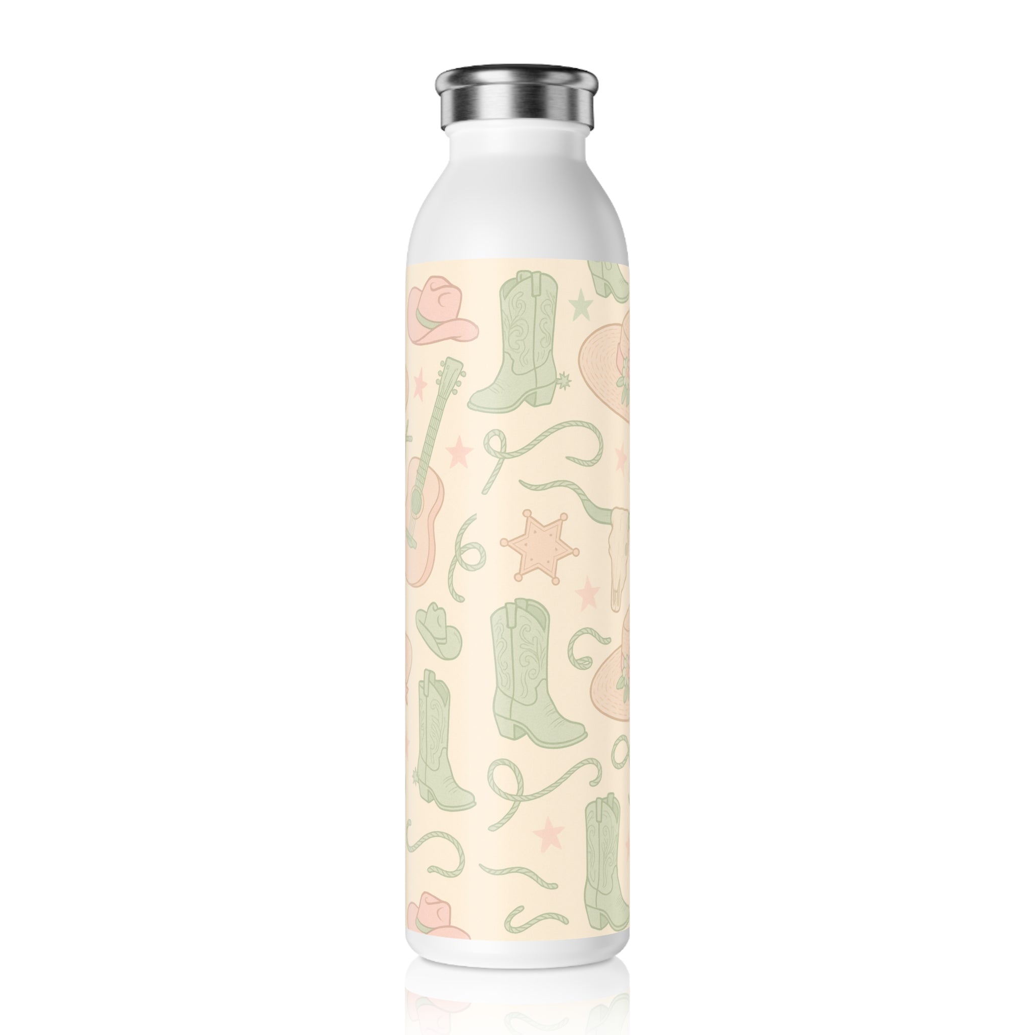 A slim, stainless steel bottle wrapped in a soft, country-inspired print. Its pastel cowboy hats, boots, ropes, and stars sit against a warm cream backdrop, giving quiet western charm without shouting. Lightweight and narrow, it slips into tote pockets and bike cages, keeping chilled water or a comforting hot brew ready for hours. The matte double-wall body feels smooth in hand while the glossy print adds a delicate sheen where the pattern catches the light. It’s the kind of bottle you reach for on morning errands, lining up at outdoor markets, or when you want a small piece of calm and nostalgia by your side.