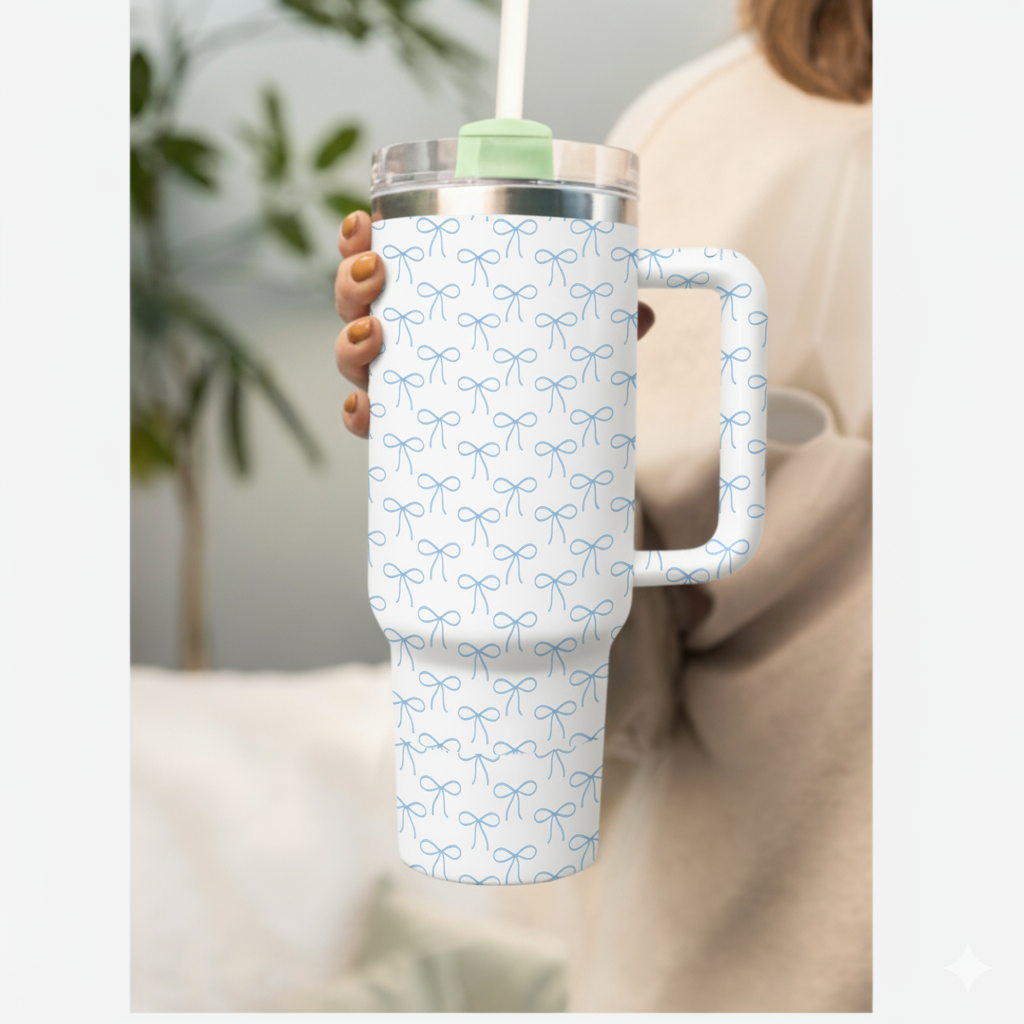 • 40oz Vacuum Tumbler - Delicate Blue Bow Pattern Insulated Travel Mug