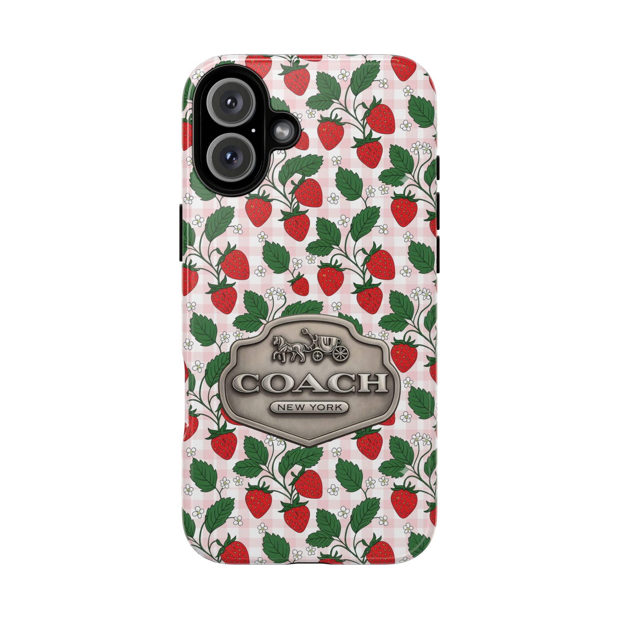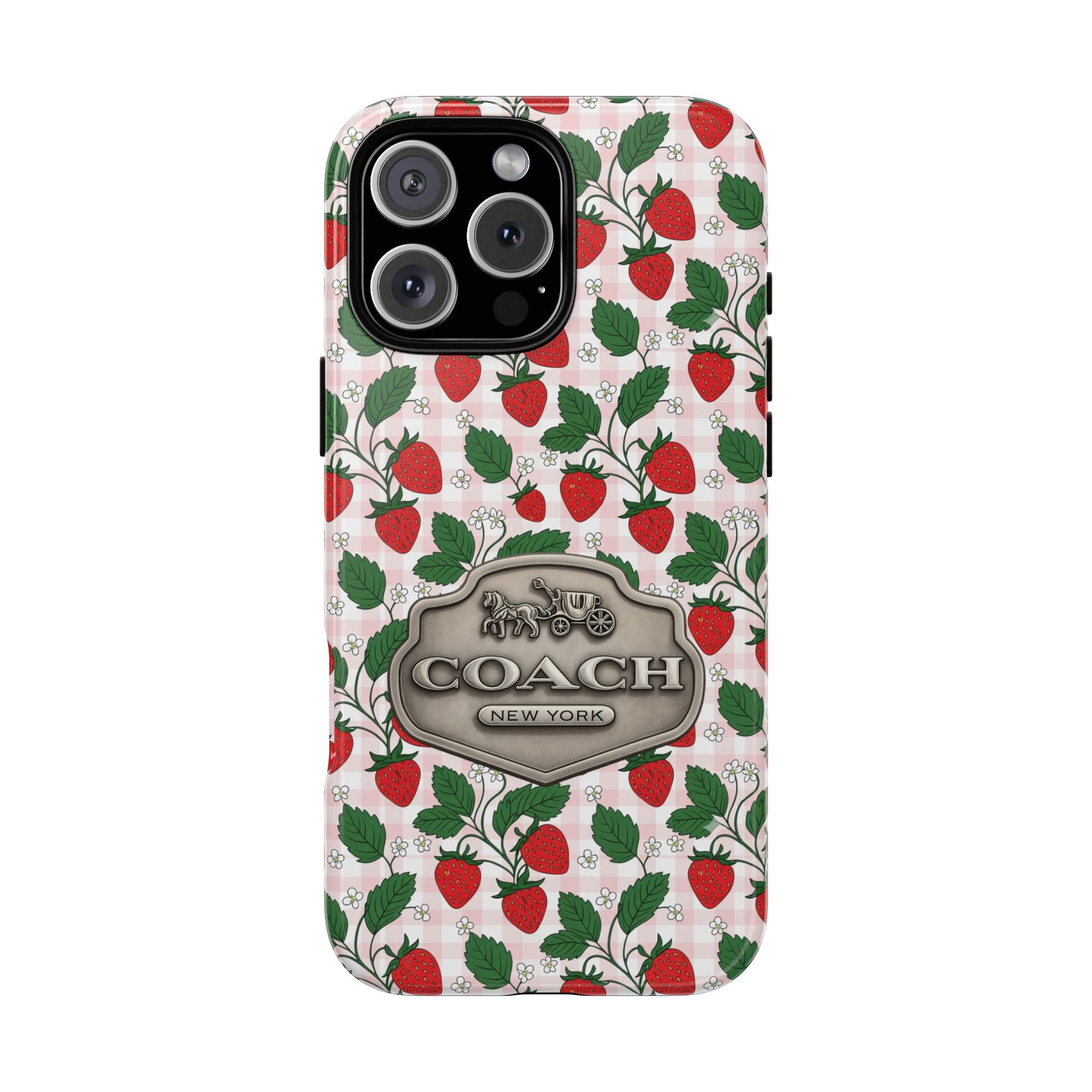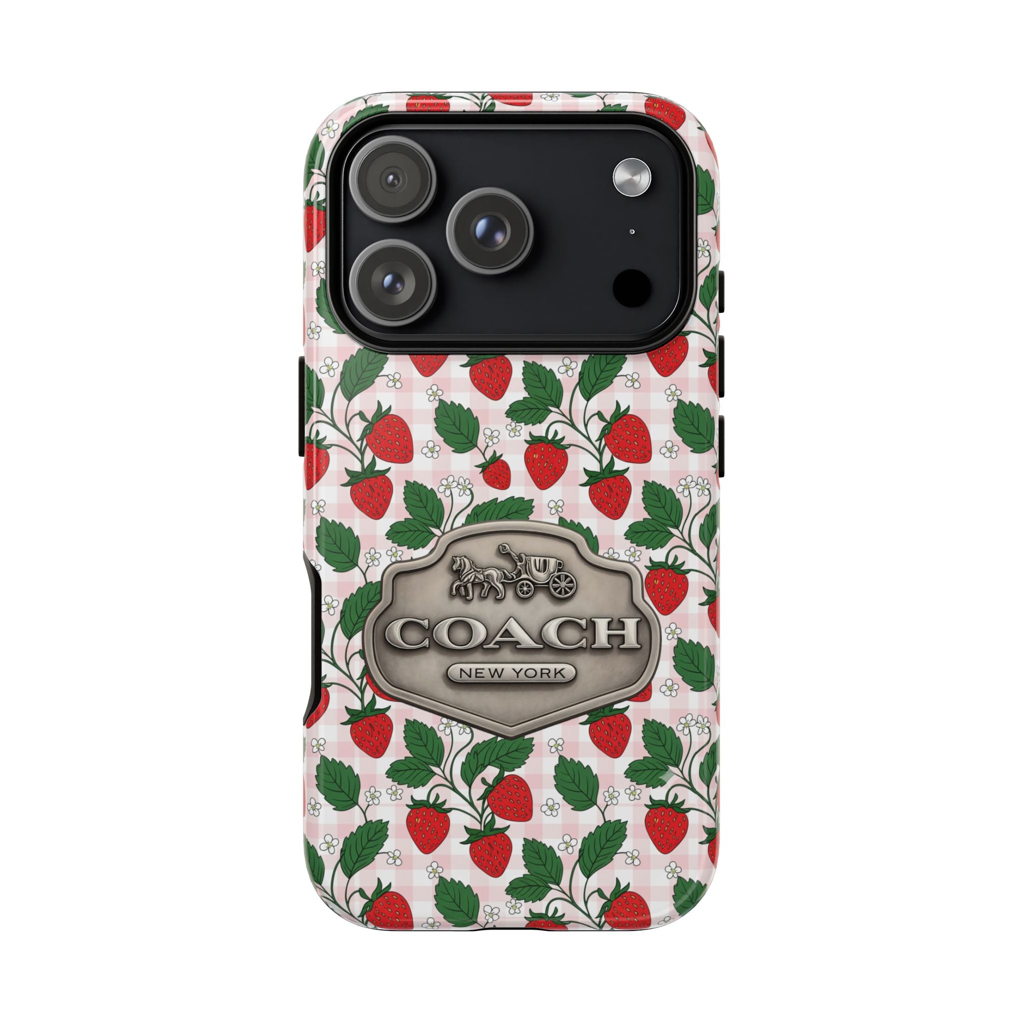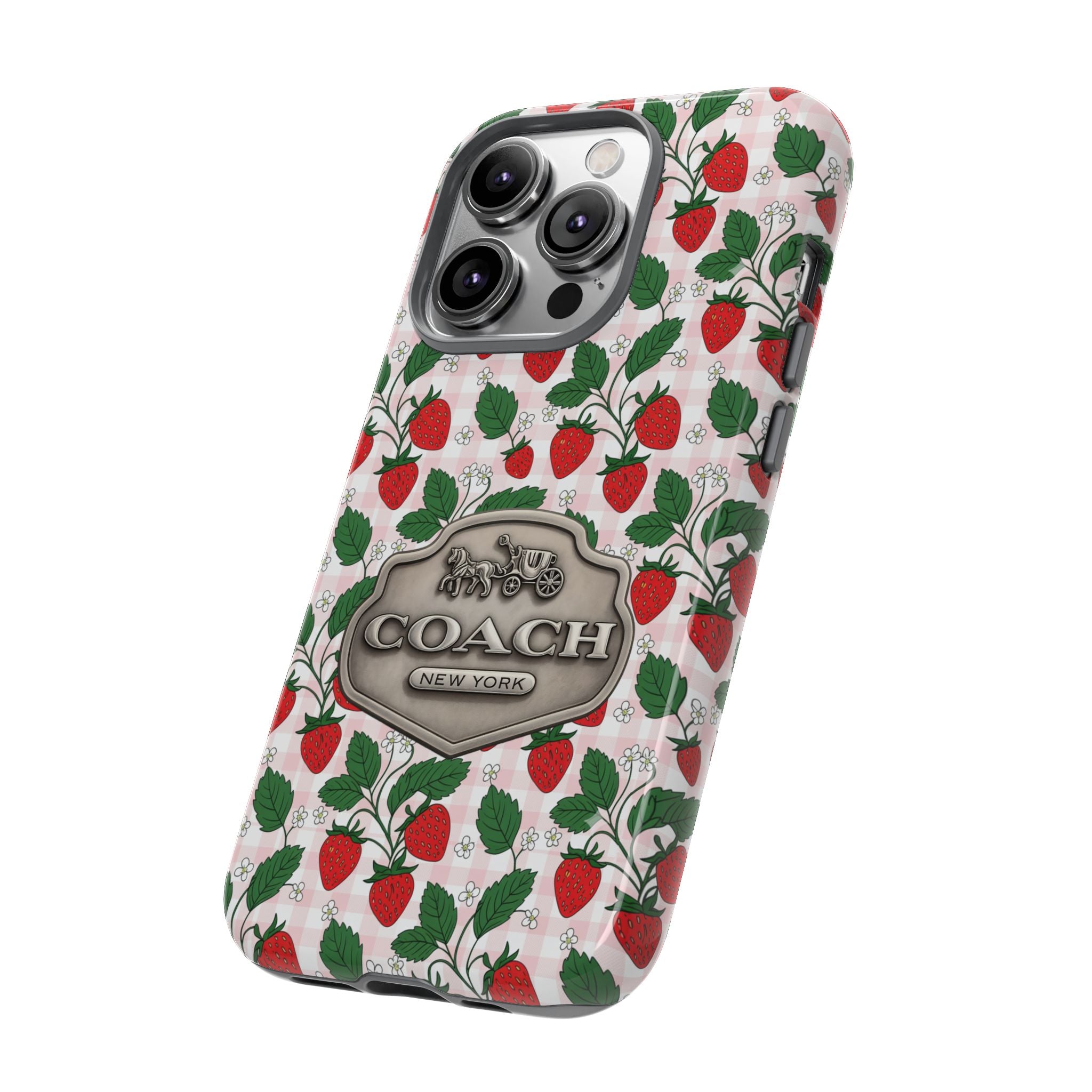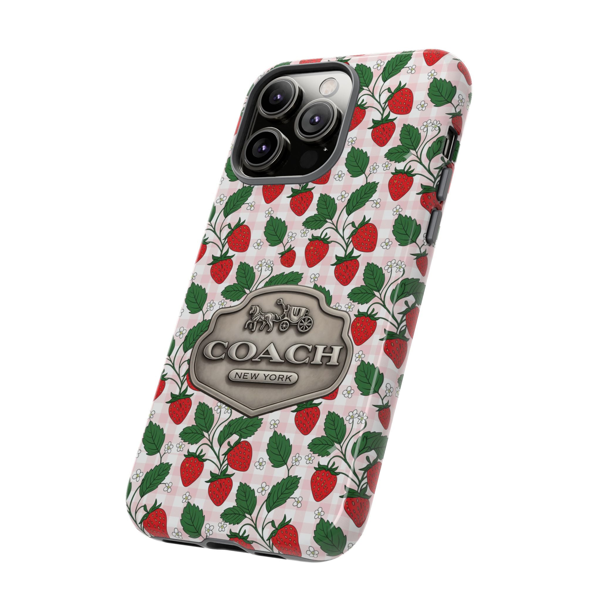 Strawberries Pink Gingham Phone Case, Tough Cases, Coach Inspired Cute Floral Design, Gift for Her, Spring Accessory, Chic Tech Gear