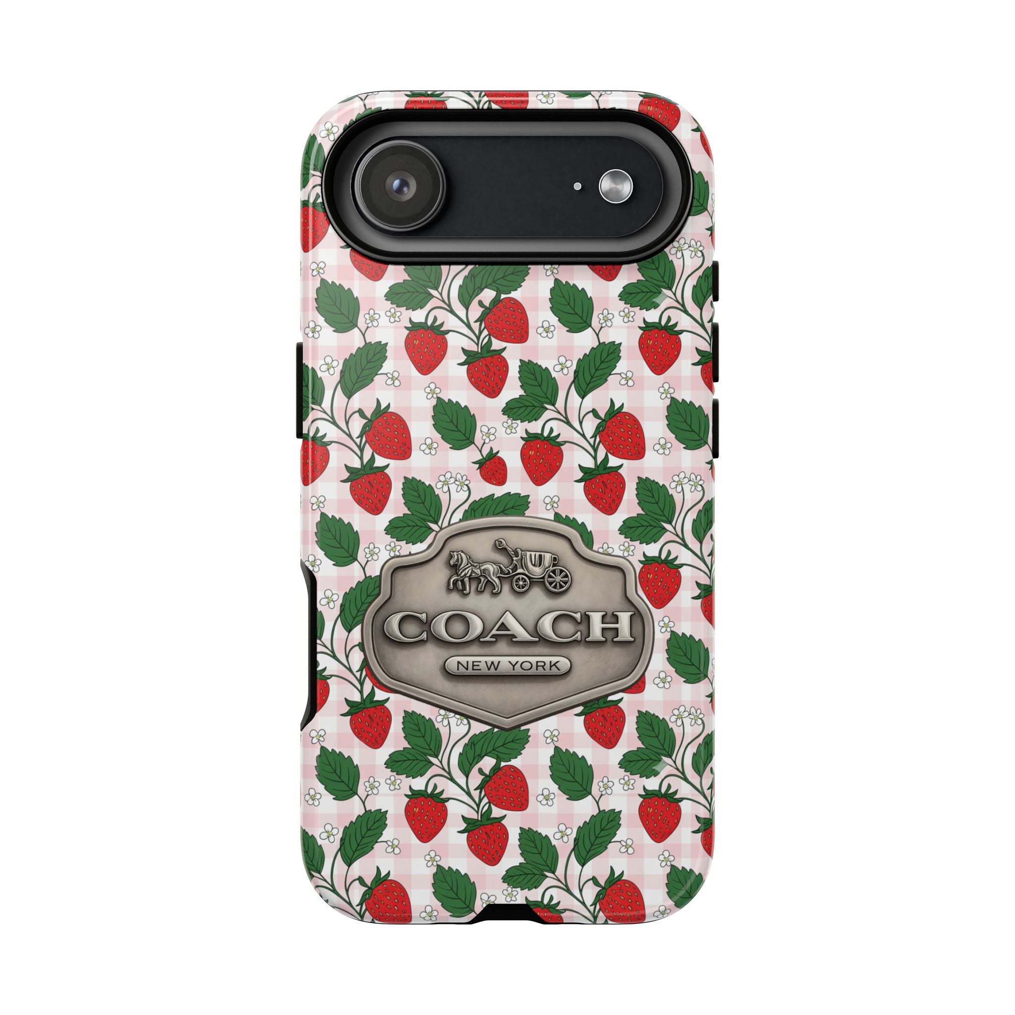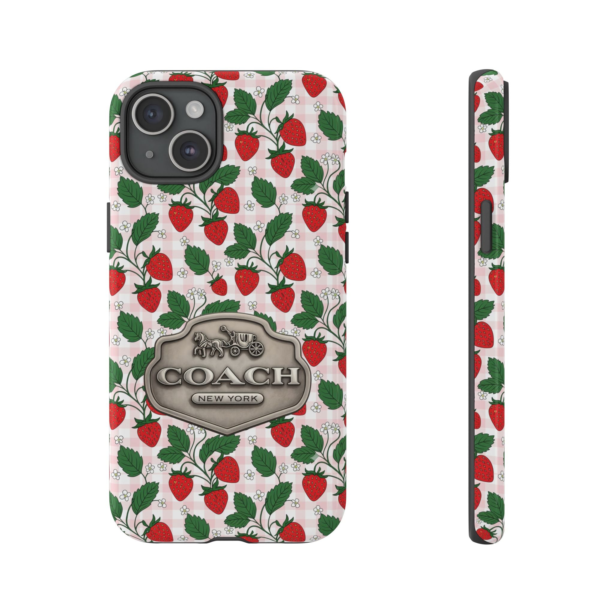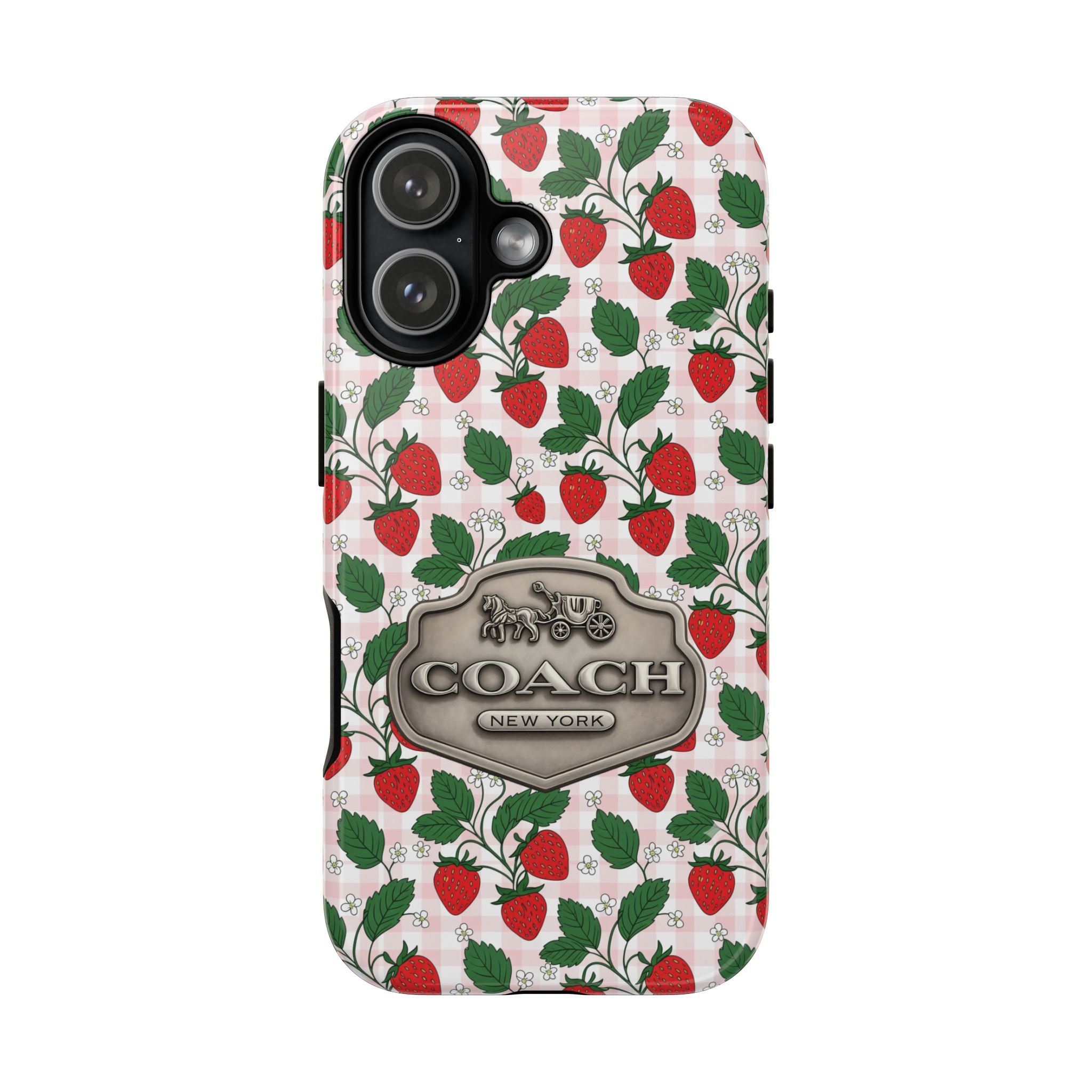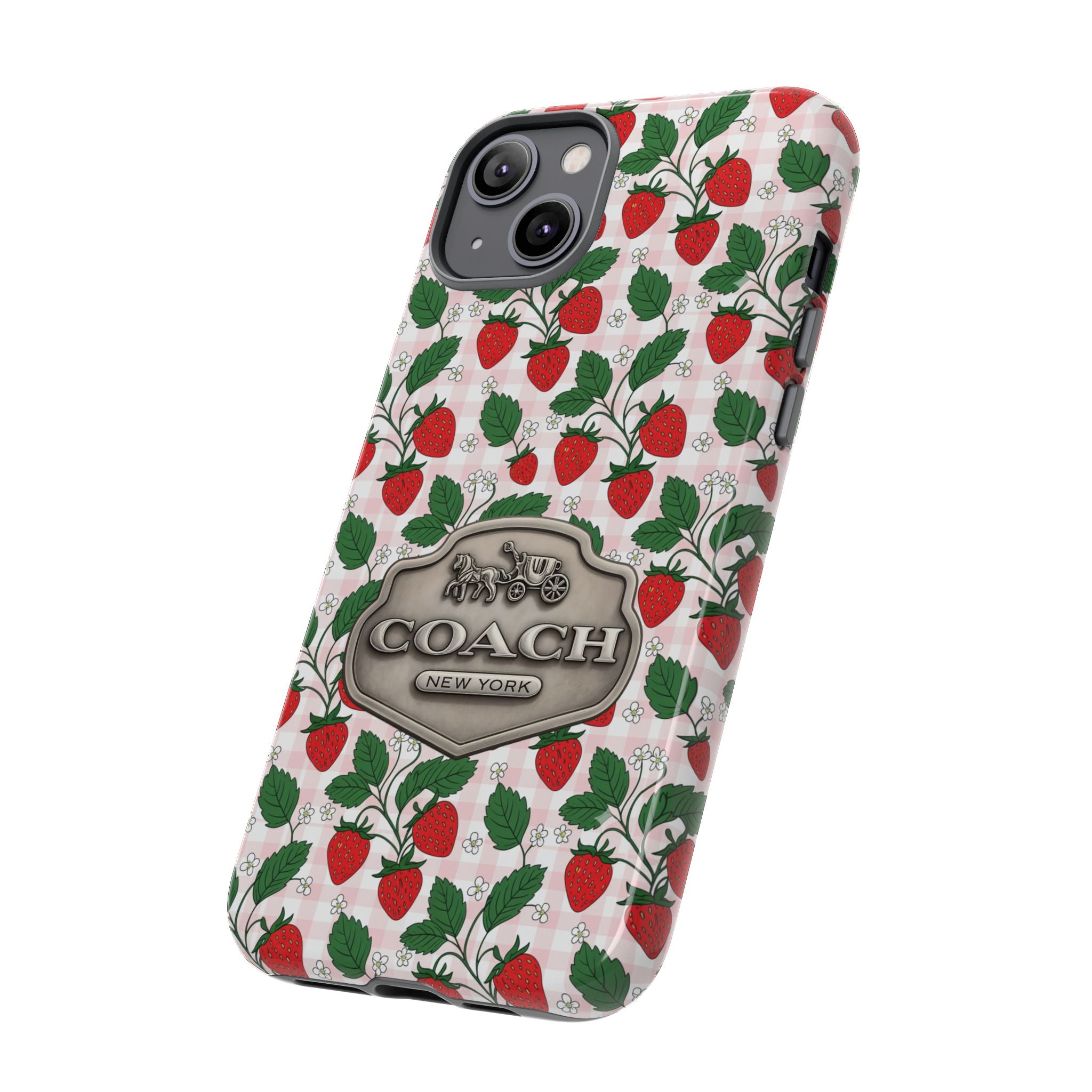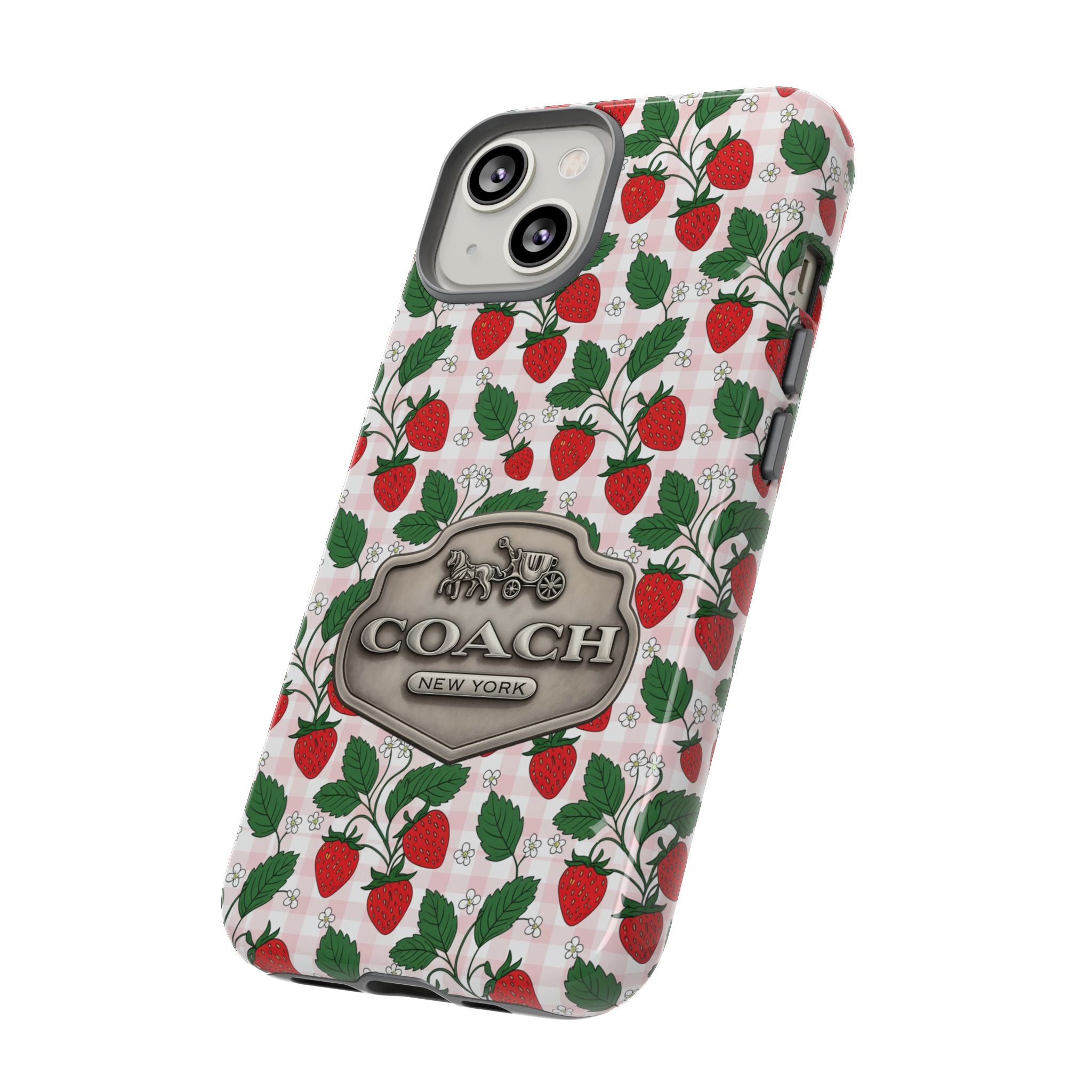 Strawberries Pink Gingham Phone Case, Tough Cases, Coach Inspired Cute Floral Design, Gift for Her, Spring Accessory, Chic Tech Gear