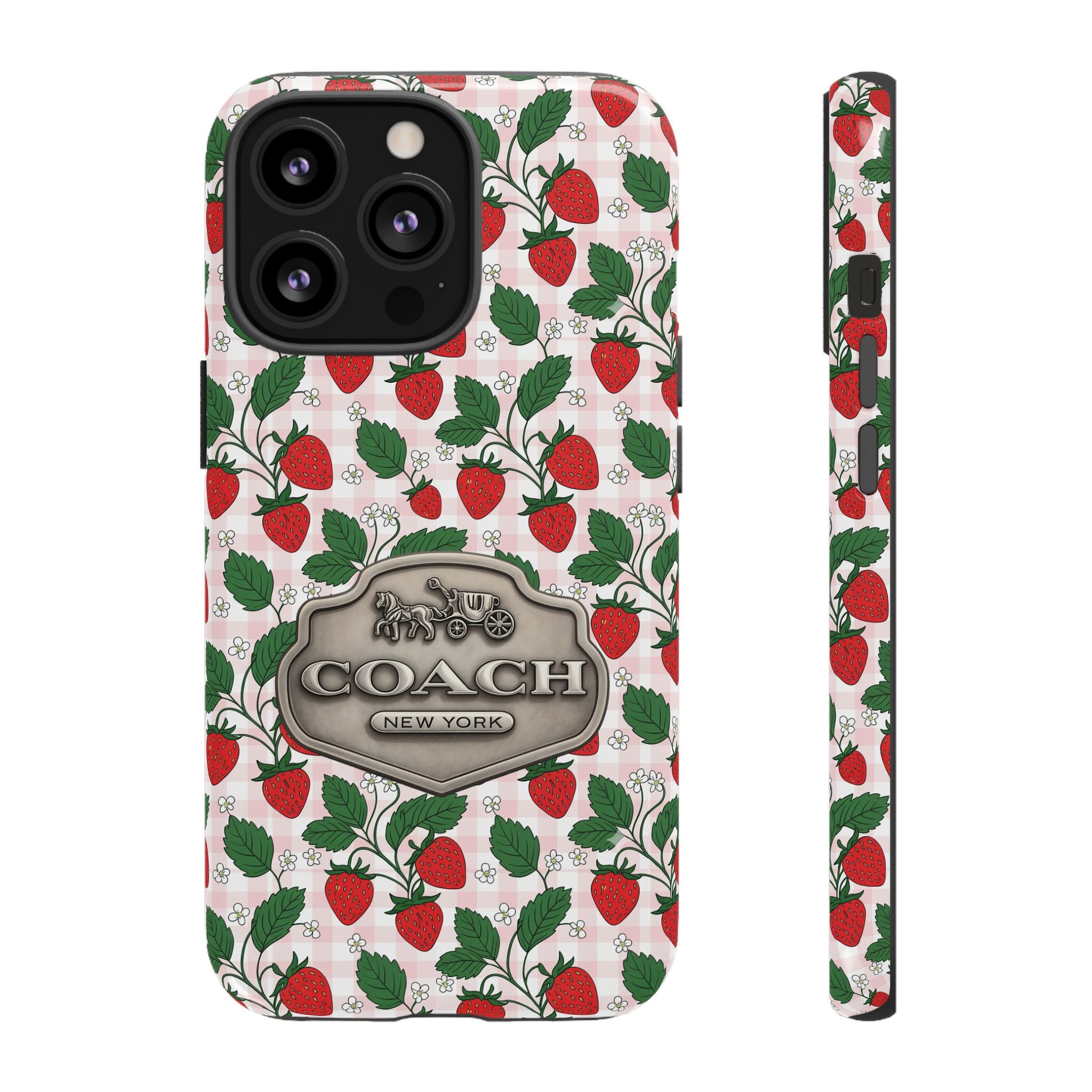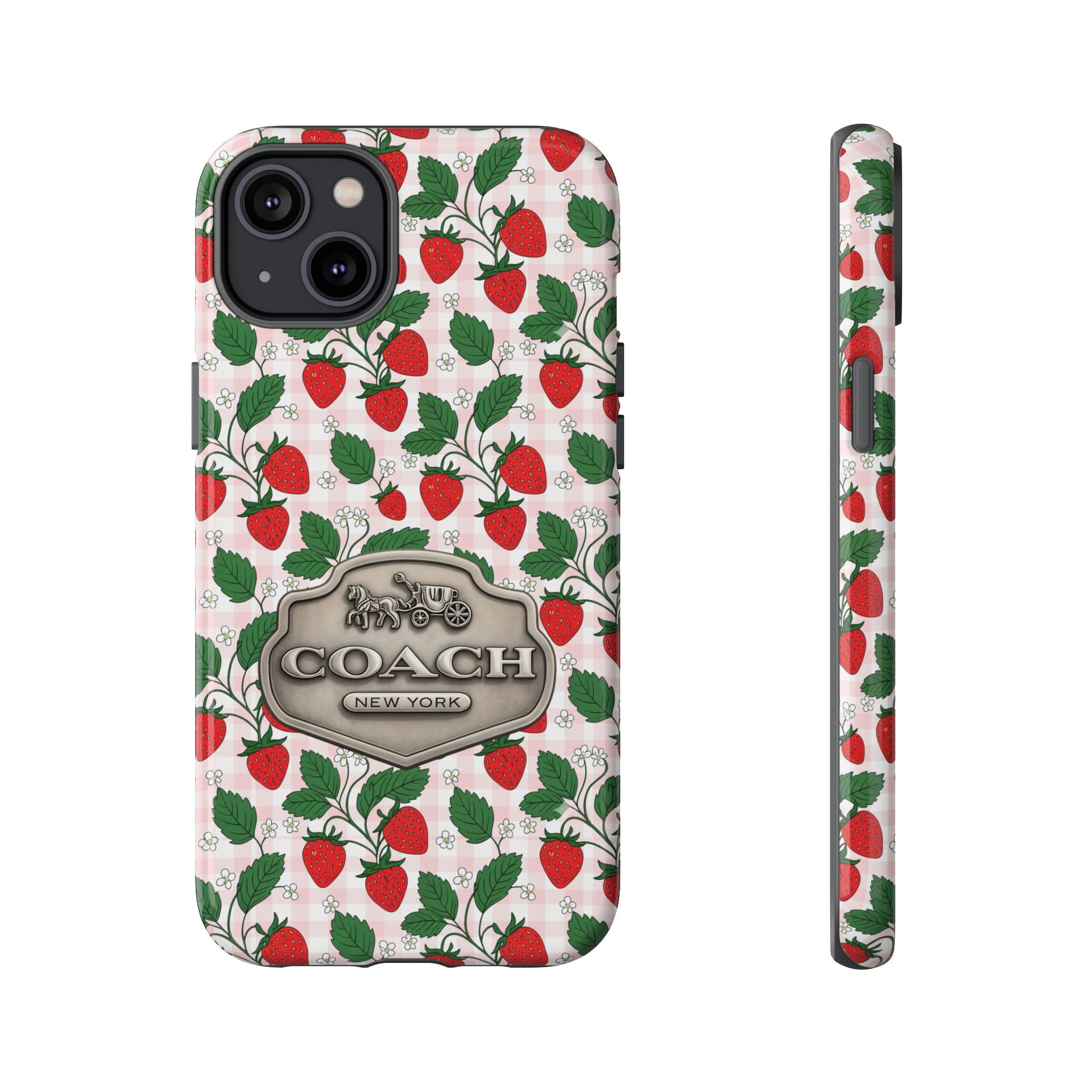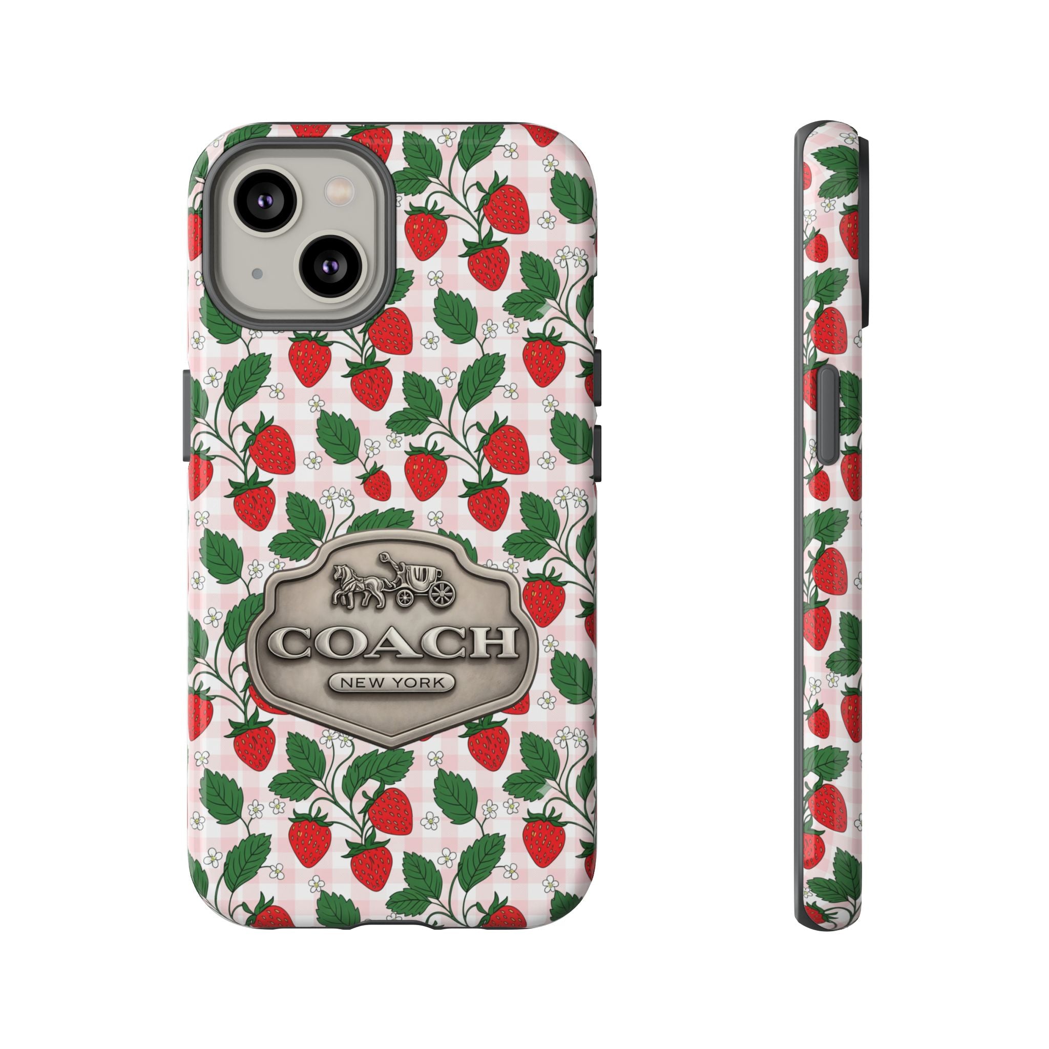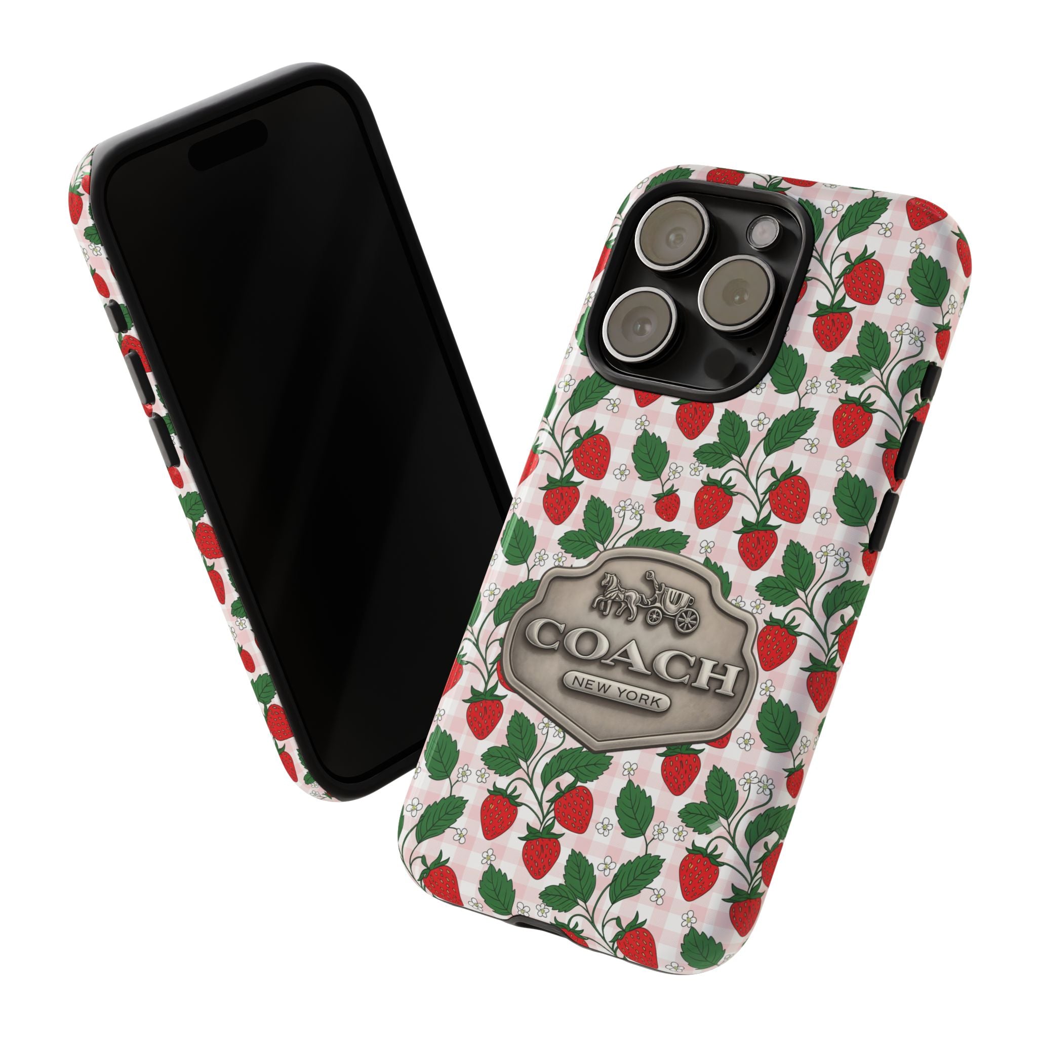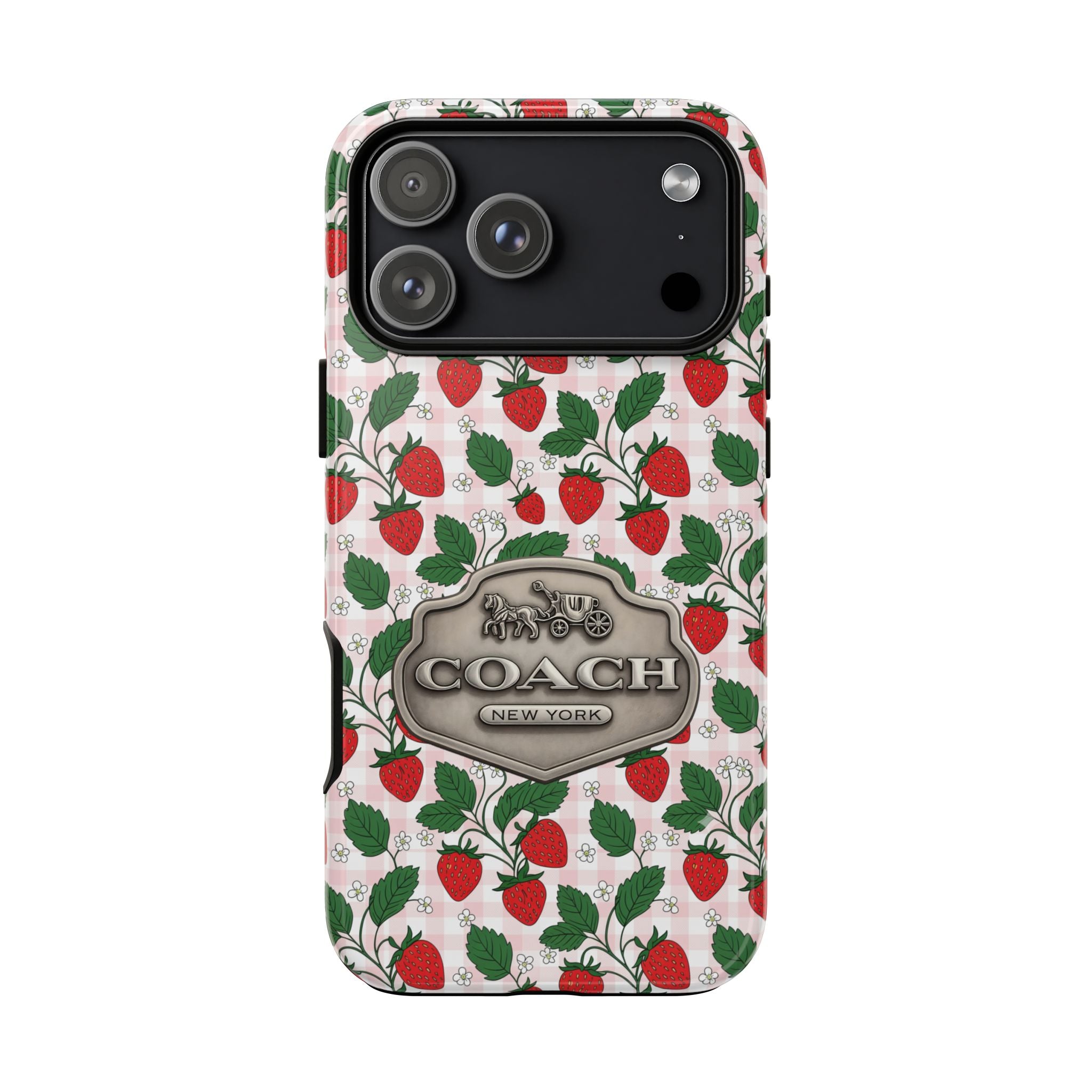 Strawberries Pink Gingham Phone Case, Tough Cases, Coach Inspired Cute Floral Design, Gift for Her, Spring Accessory, Chic Tech Gear