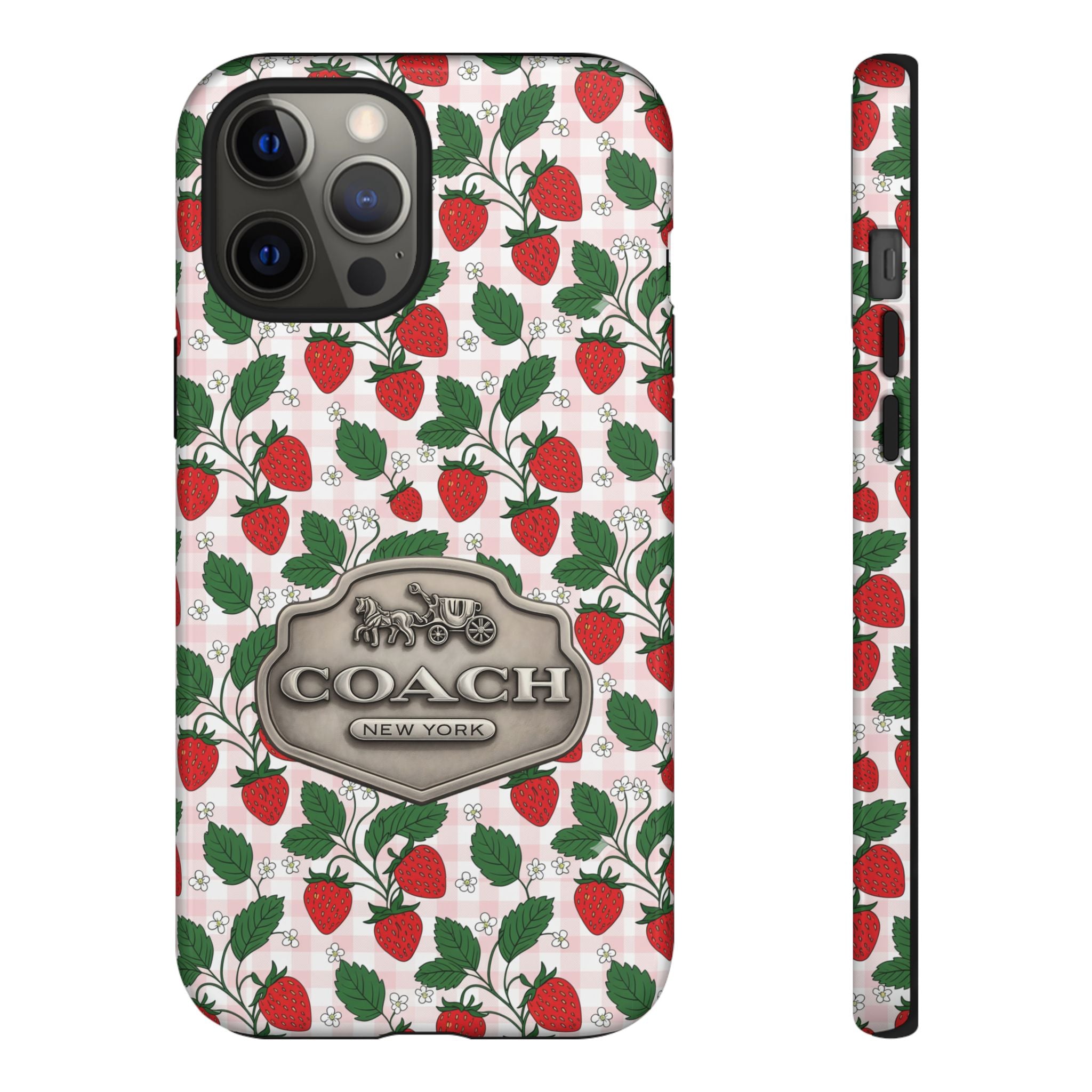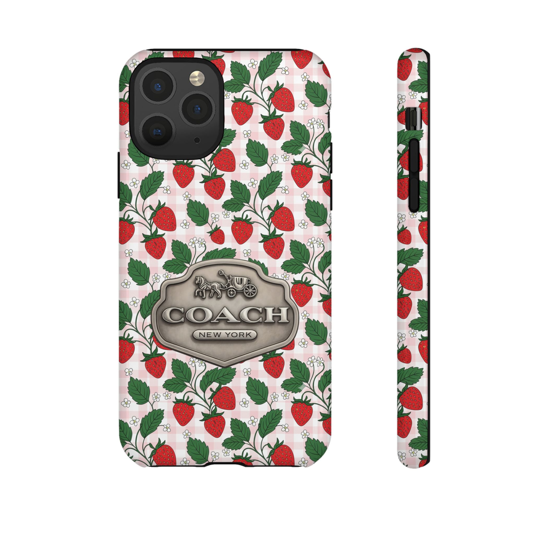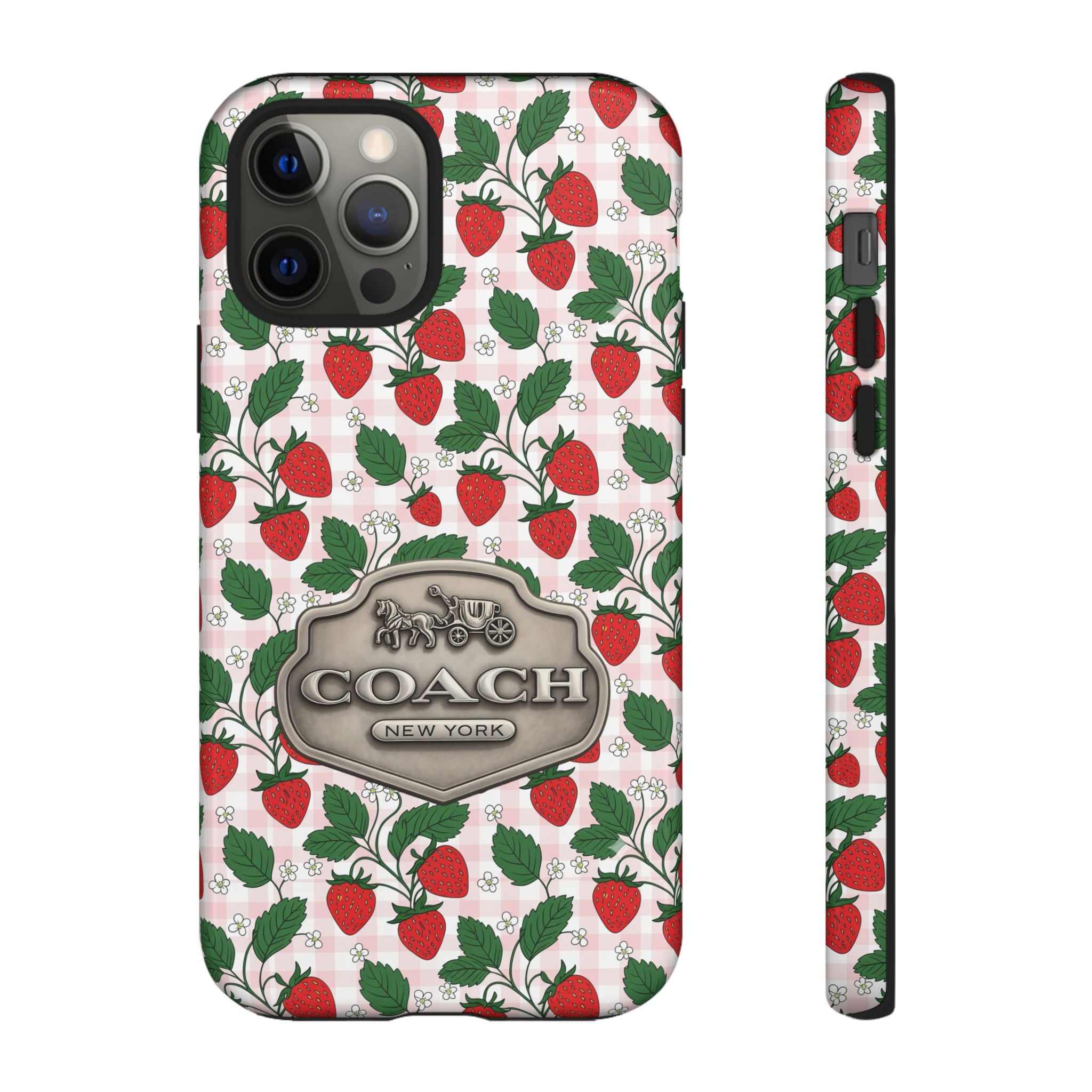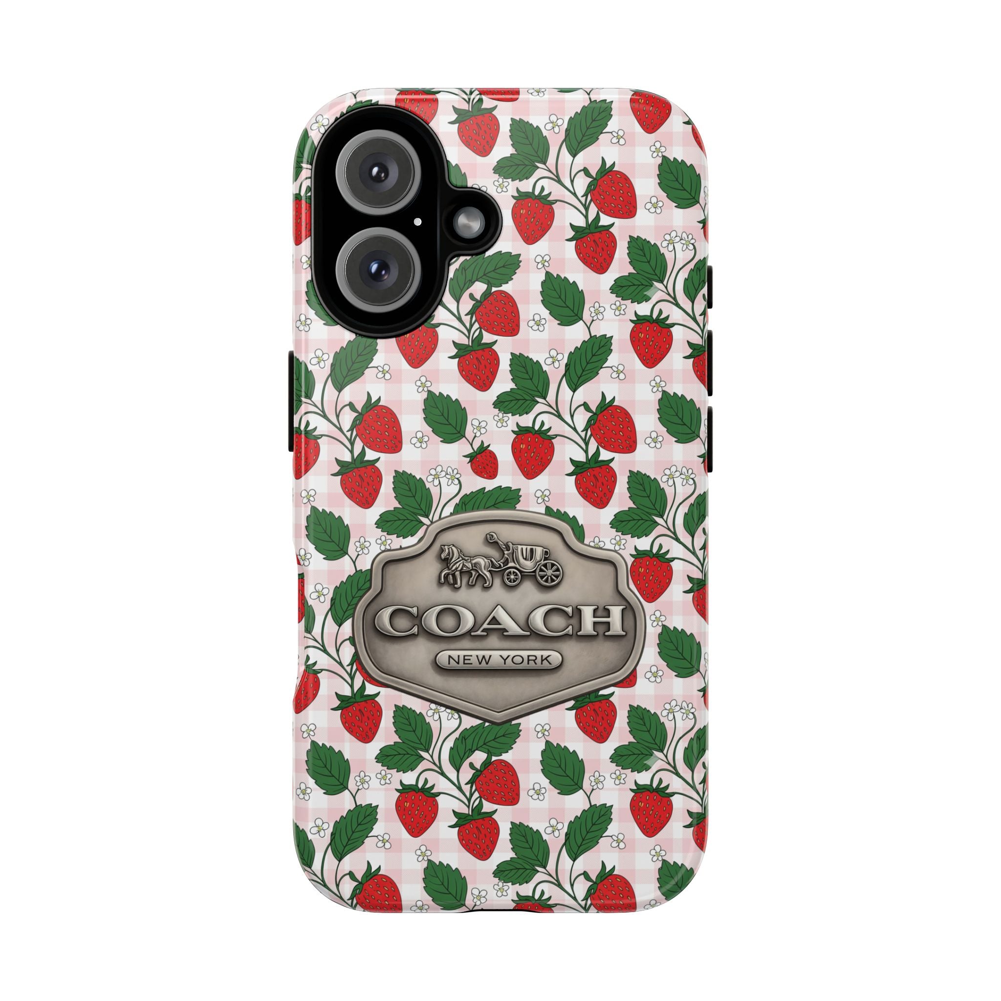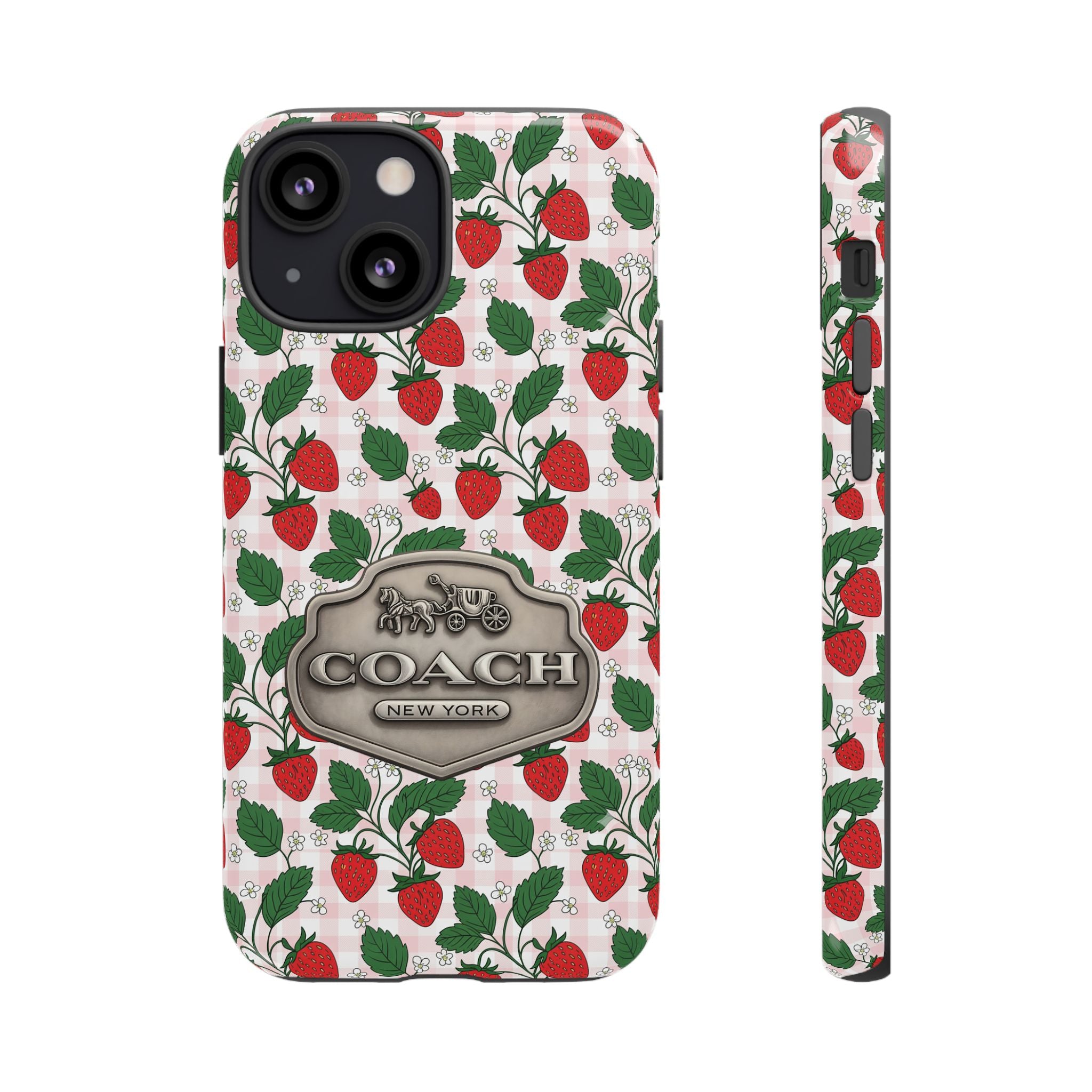 Strawberries Pink Gingham Phone Case, Tough Cases, Coach Inspired Cute Floral Design, Gift for Her, Spring Accessory, Chic Tech Gear