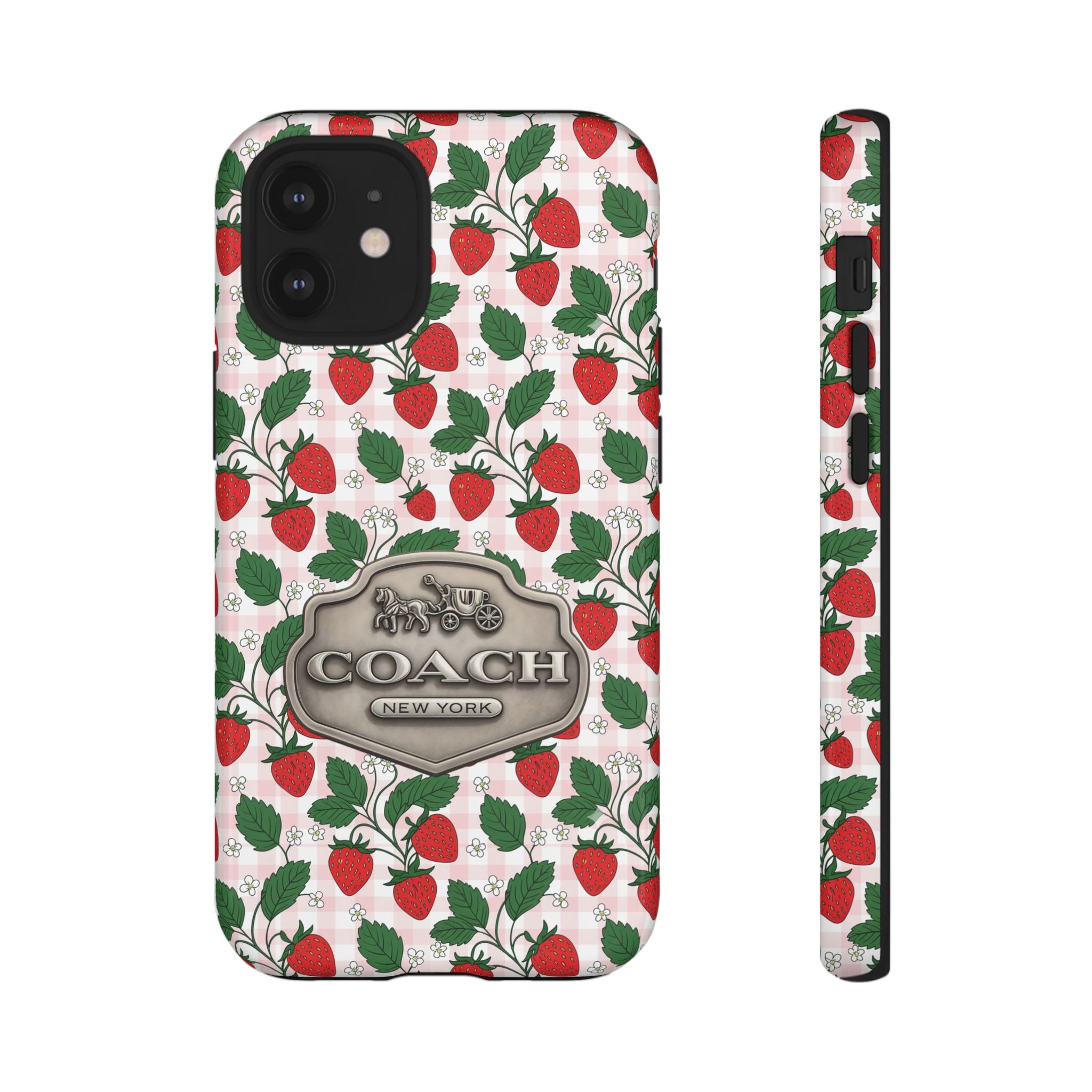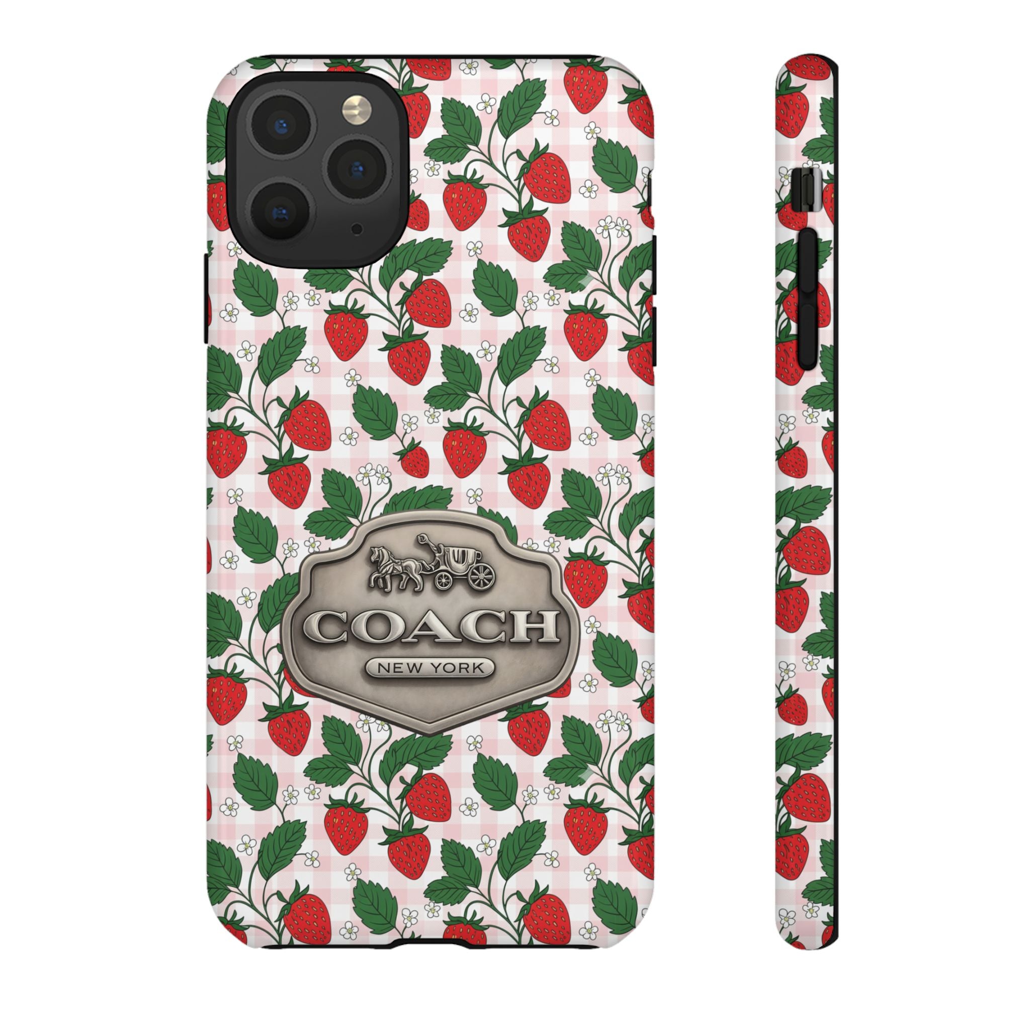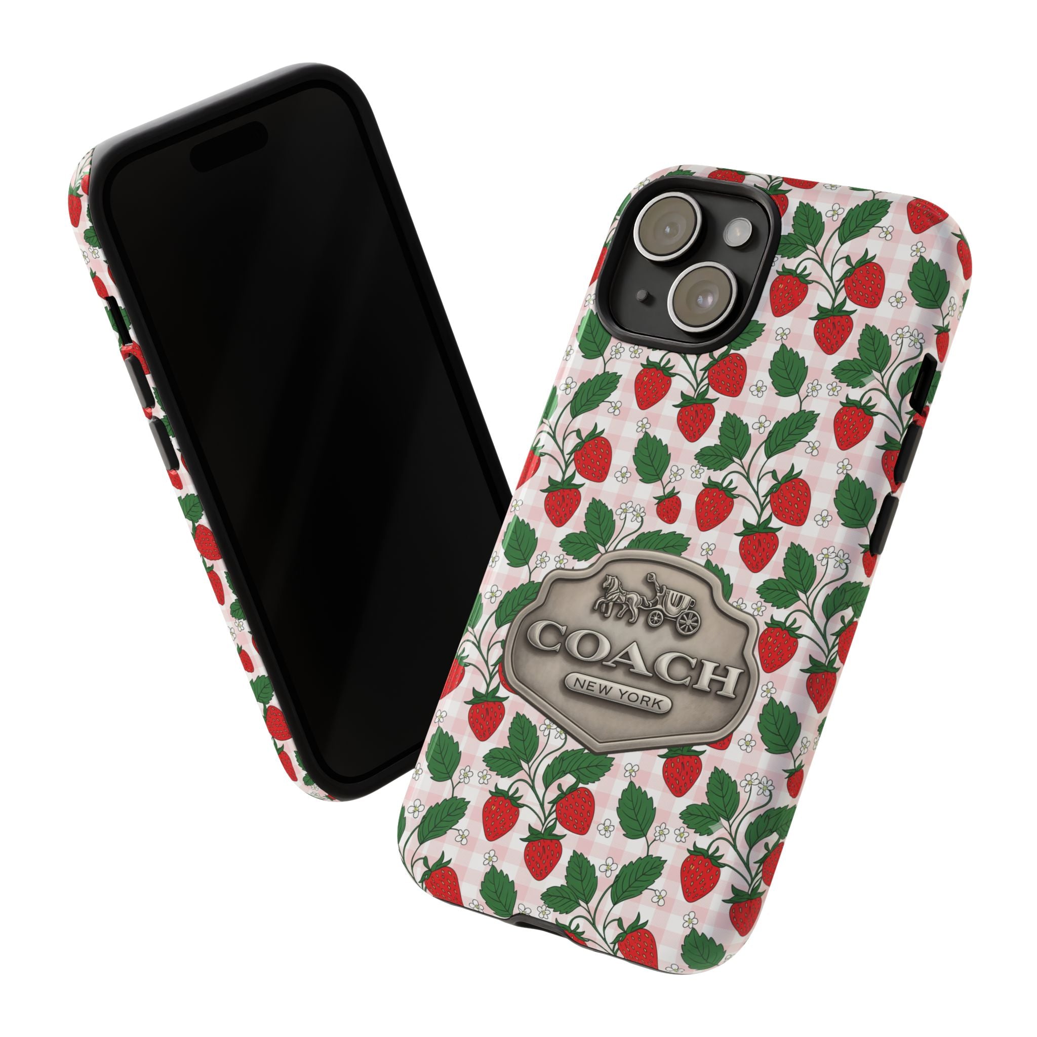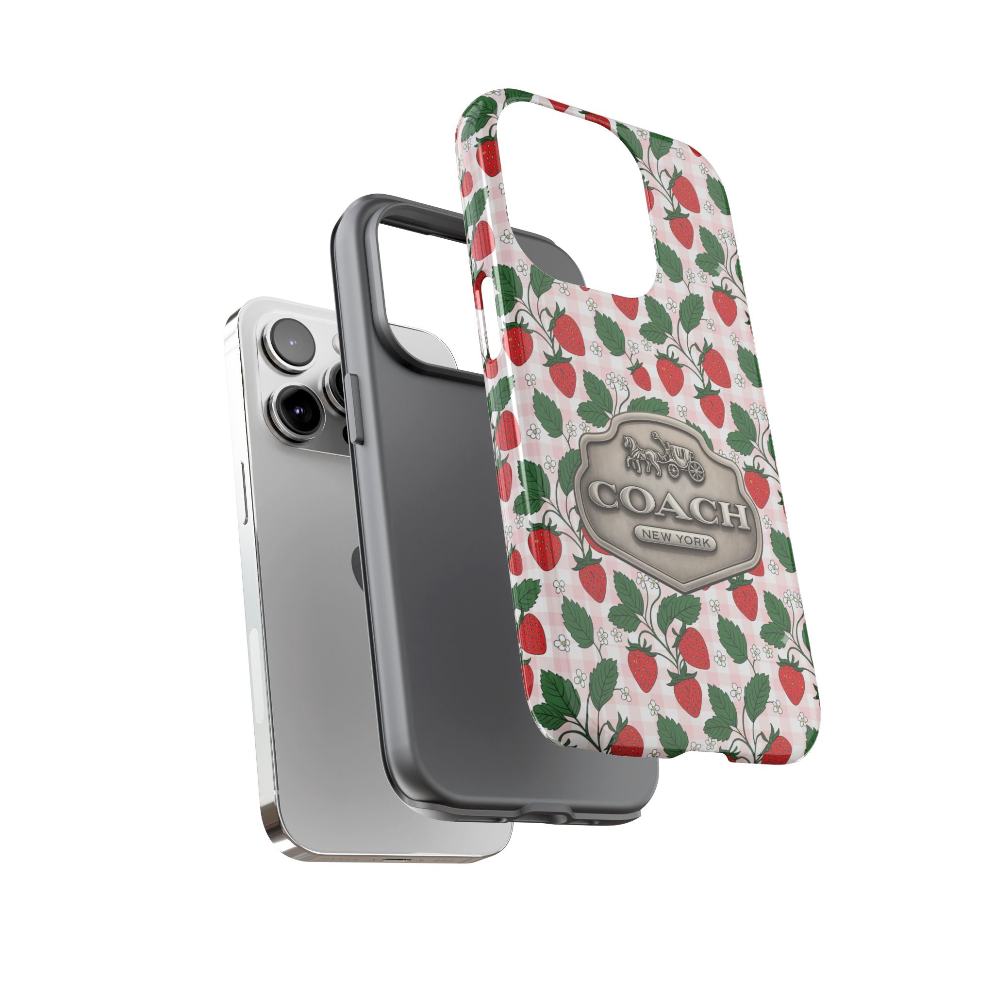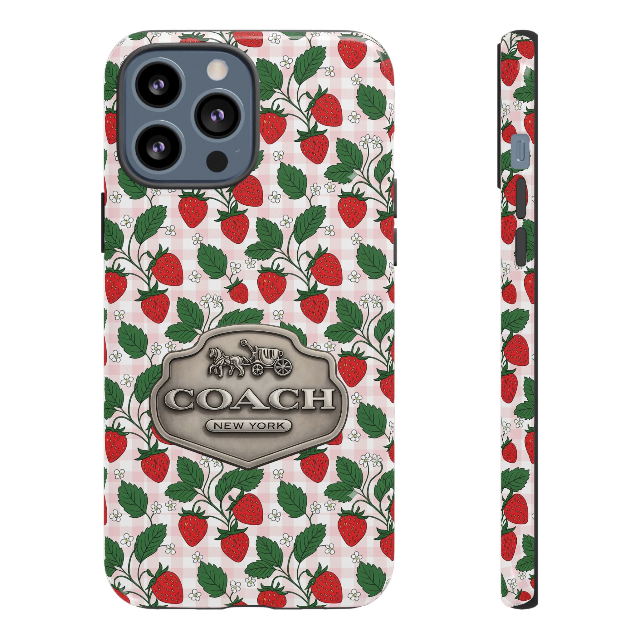 Strawberries Pink Gingham Phone Case, Tough Cases, Coach Inspired Cute Floral Design, Gift for Her, Spring Accessory, Chic Tech Gear