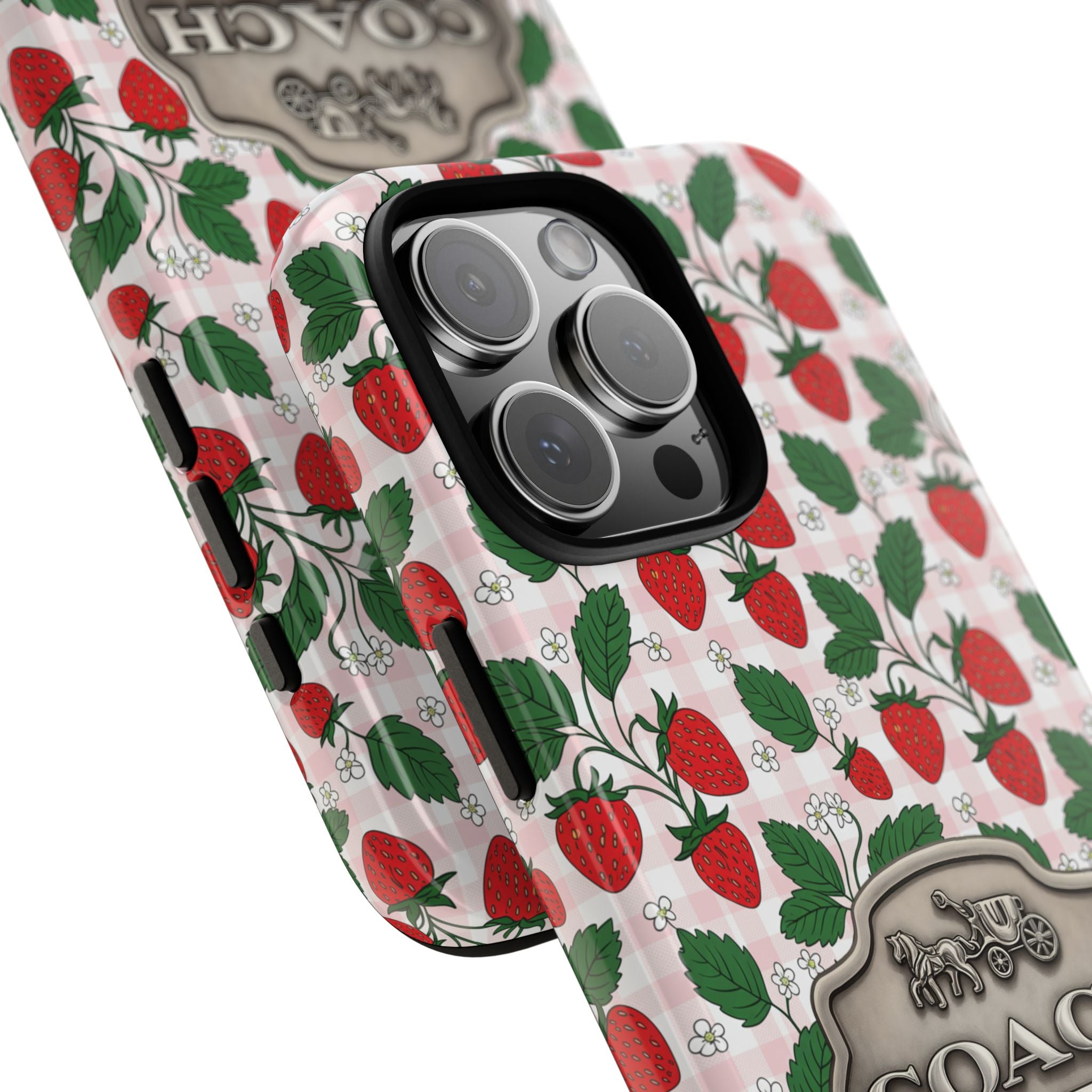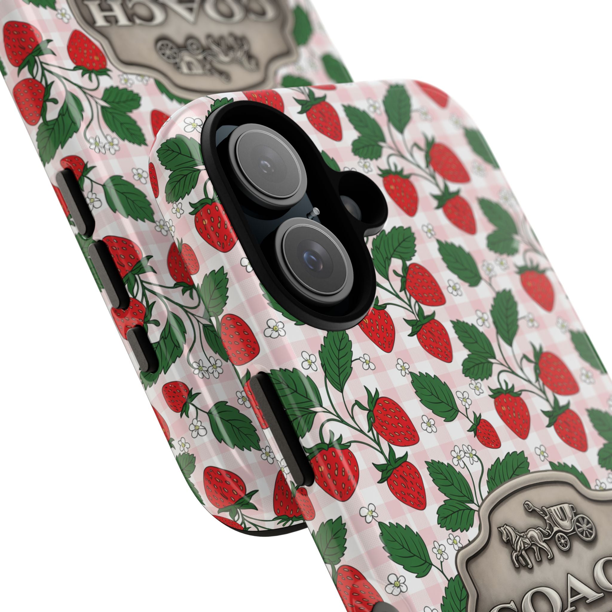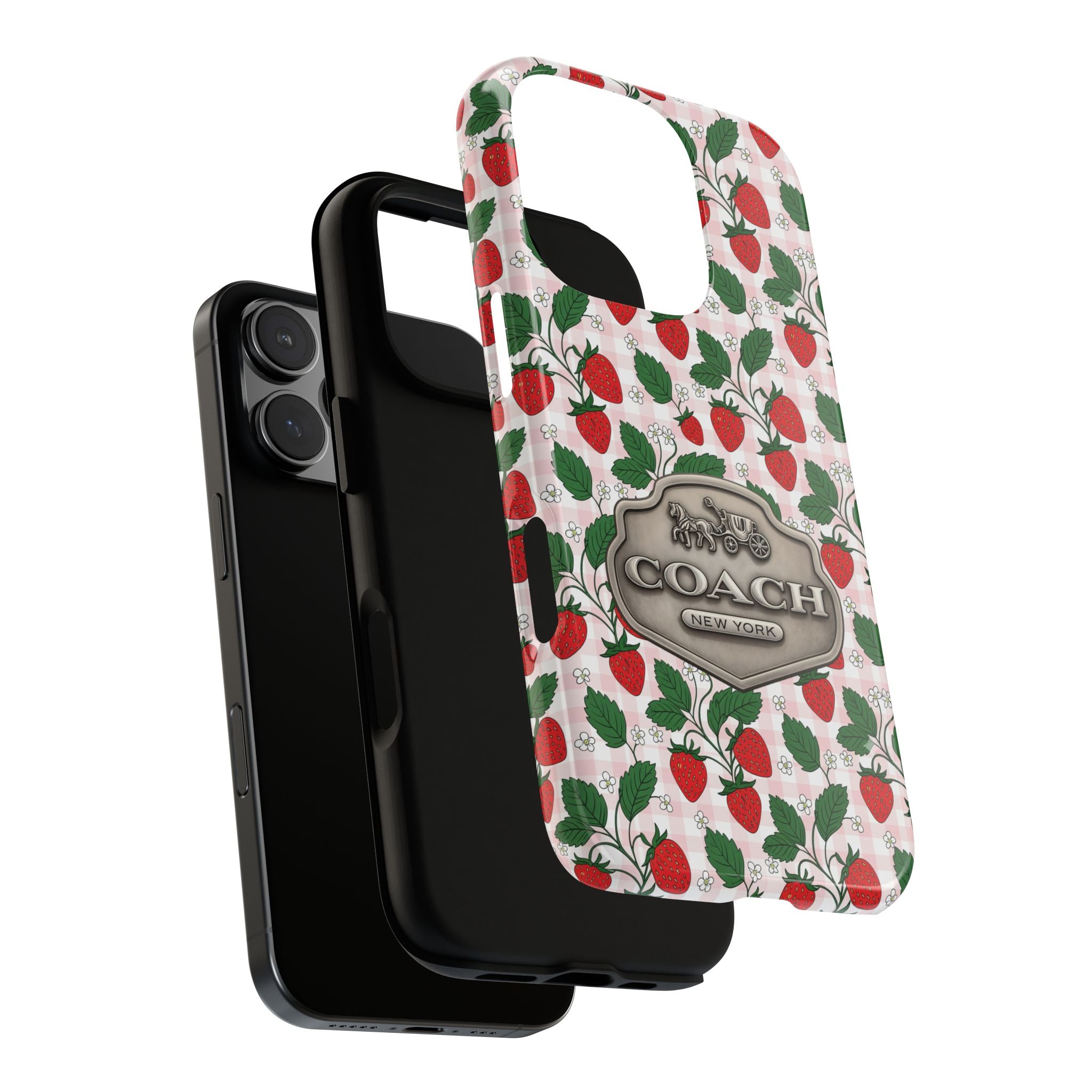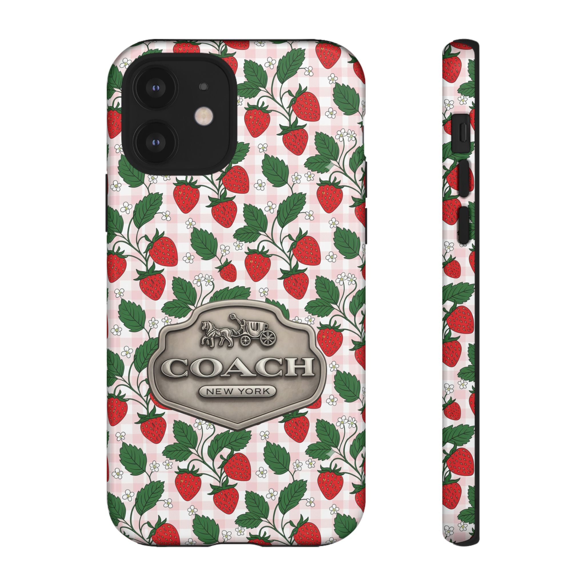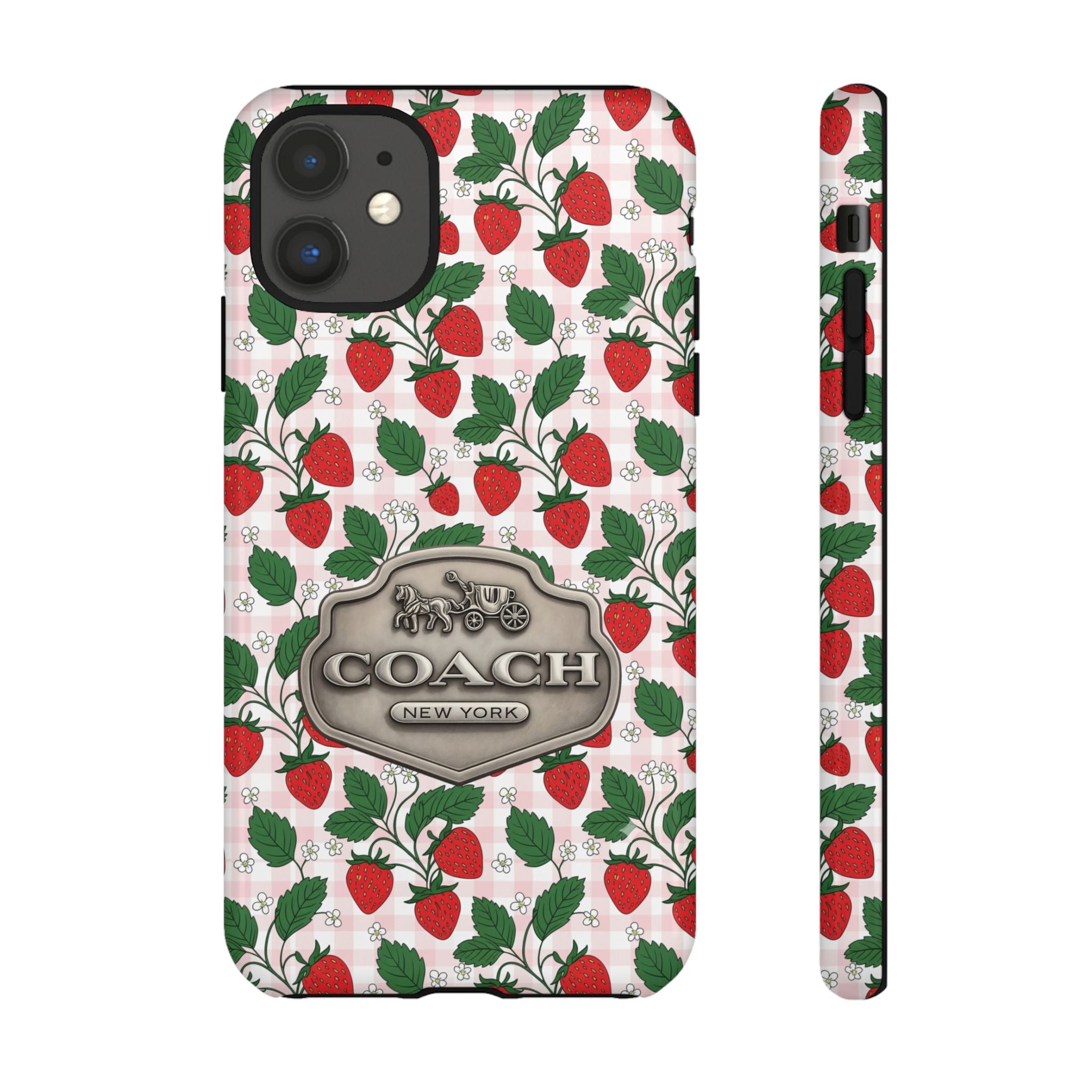 Strawberries Pink Gingham Phone Case, Tough Cases, Coach Inspired Cute Floral Design, Gift for Her, Spring Accessory, Chic Tech Gear