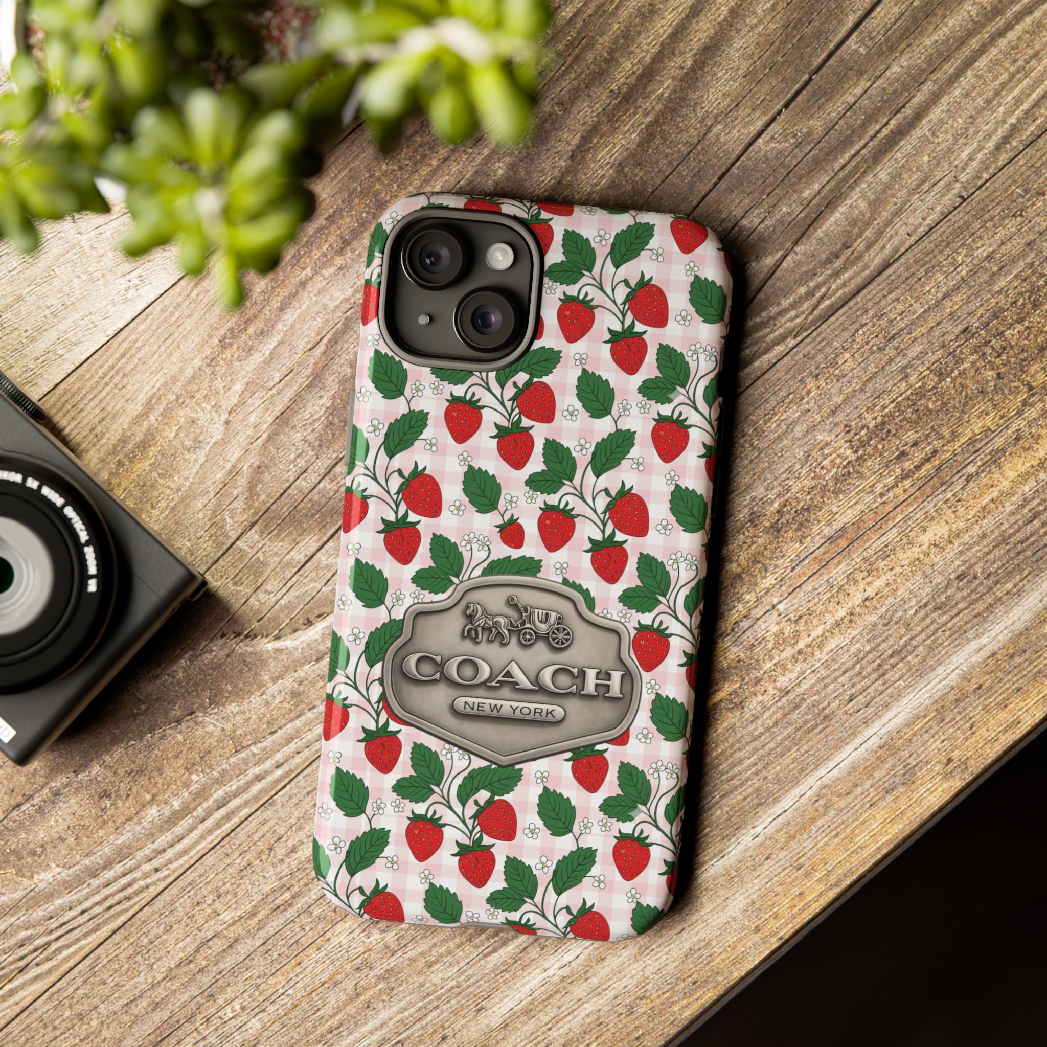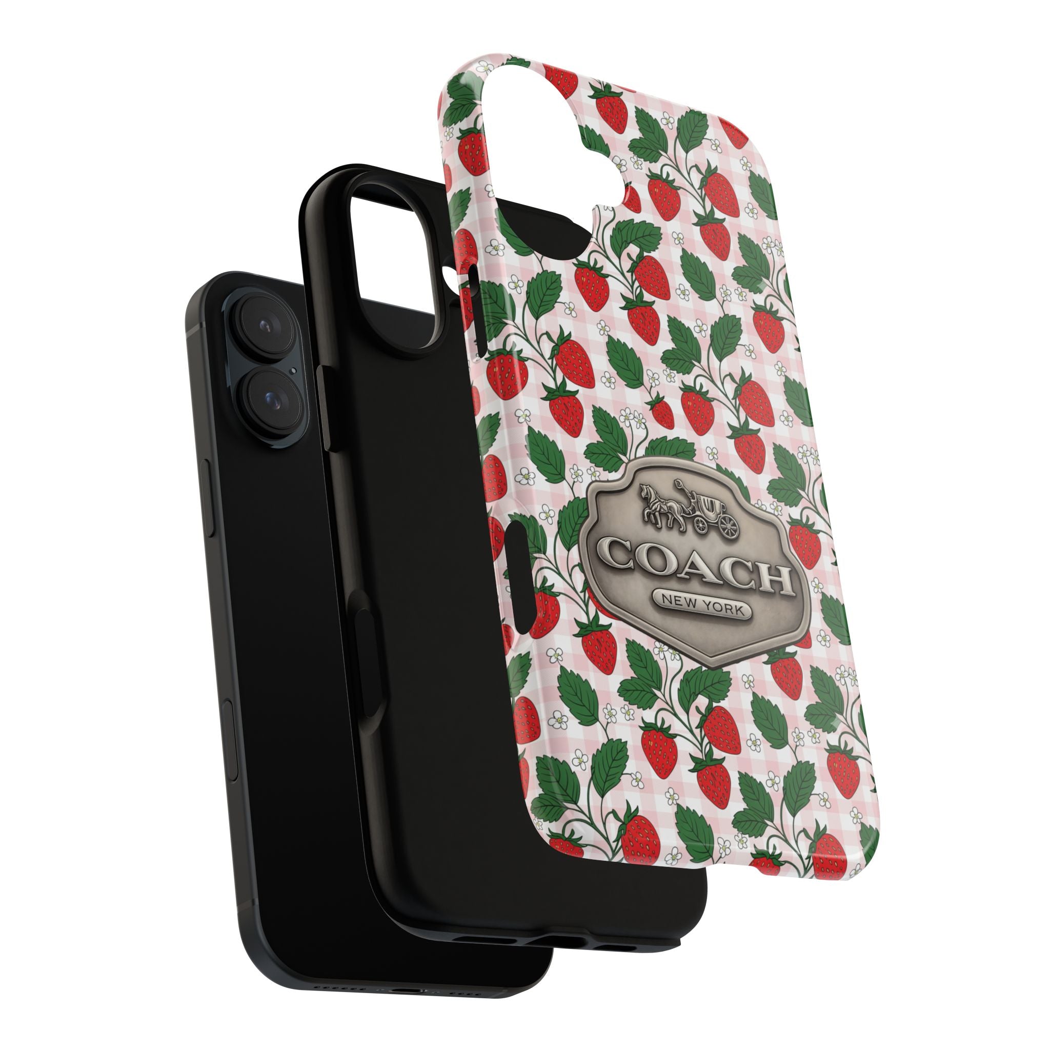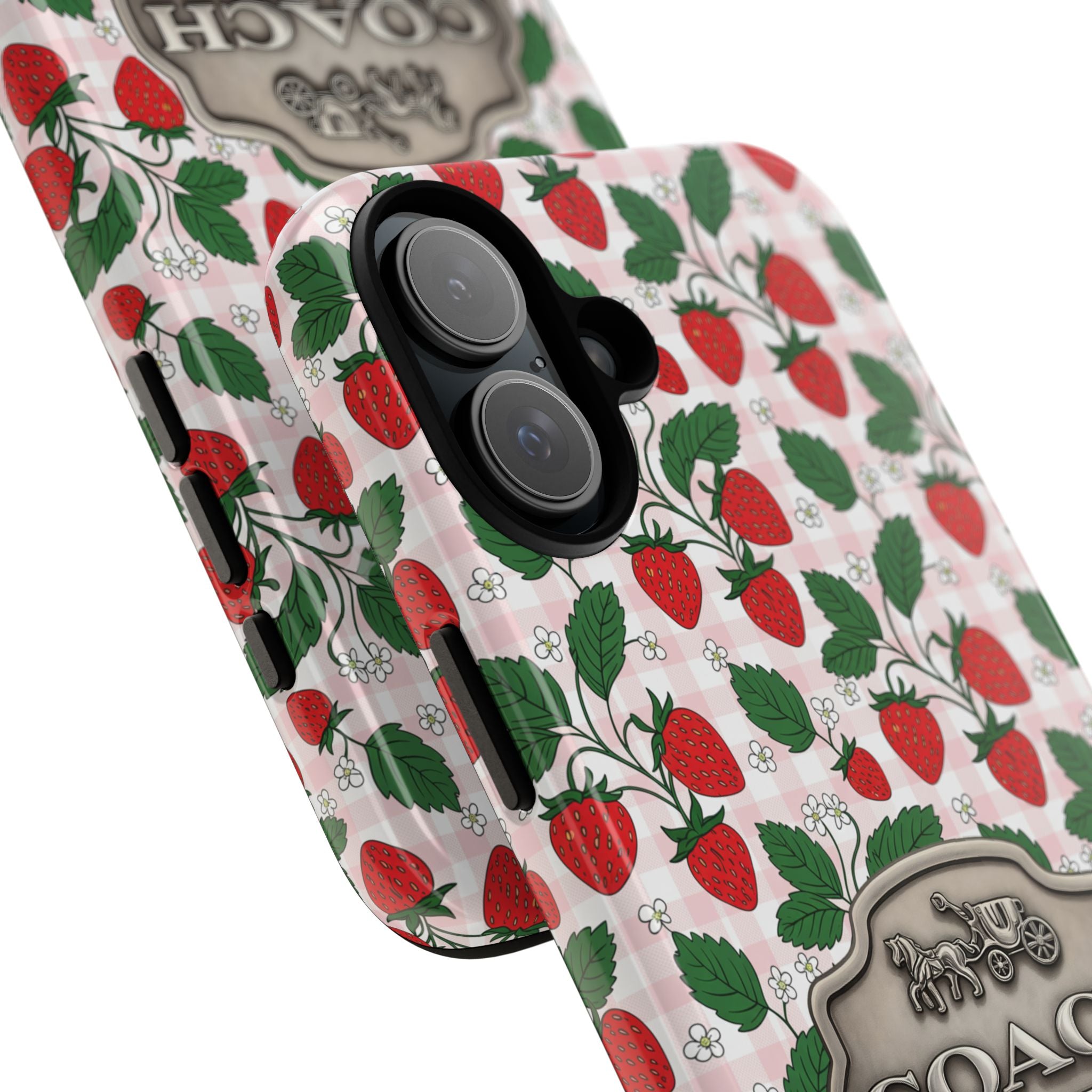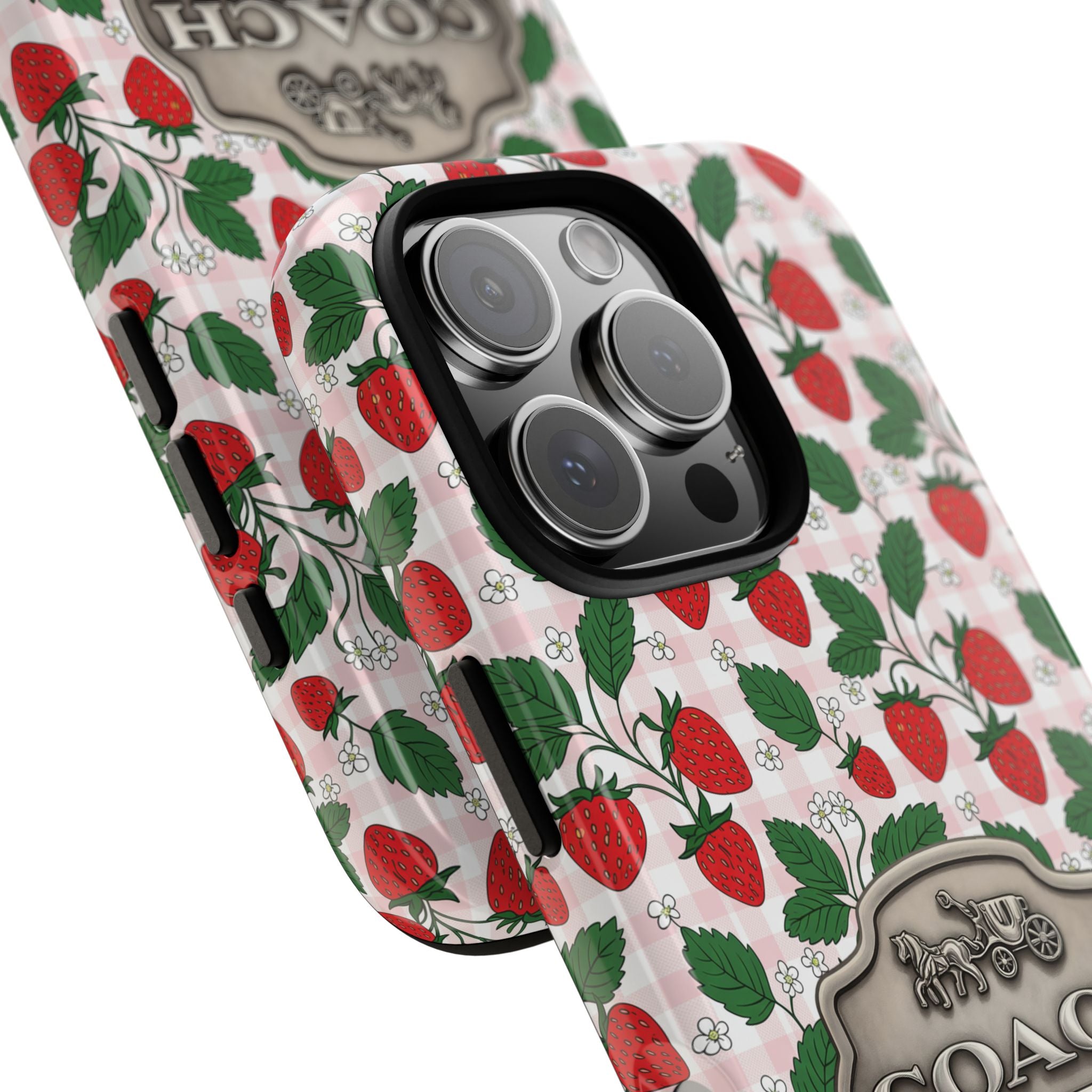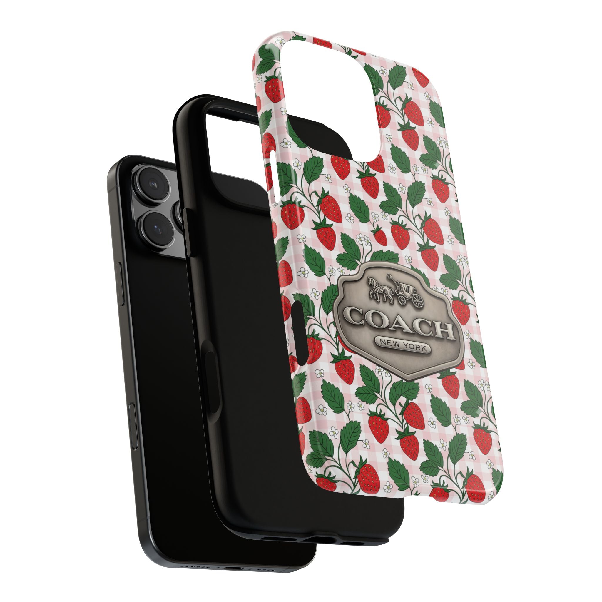 Strawberries Pink Gingham Phone Case, Tough Cases, Coach Inspired Cute Floral Design, Gift for Her, Spring Accessory, Chic Tech Gear