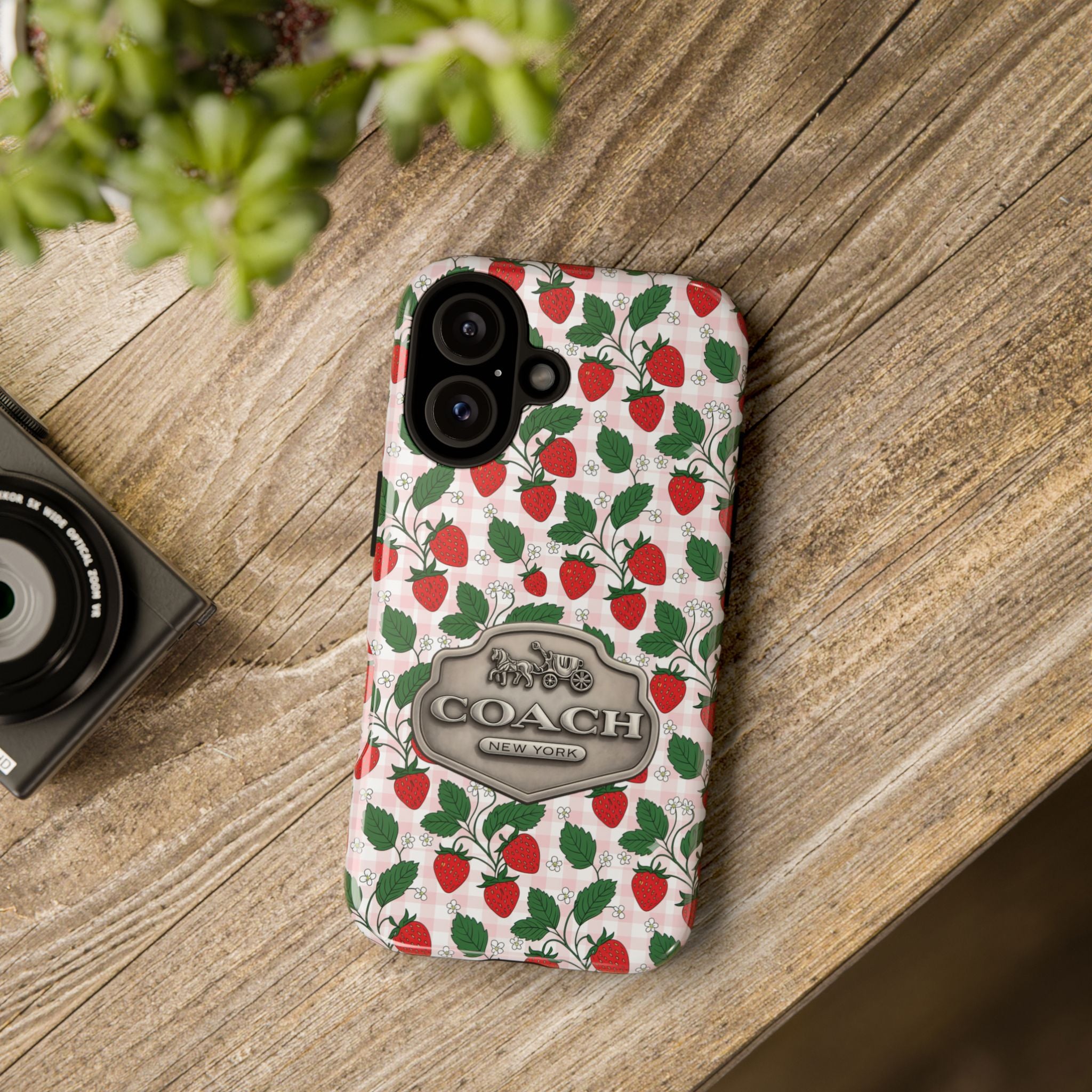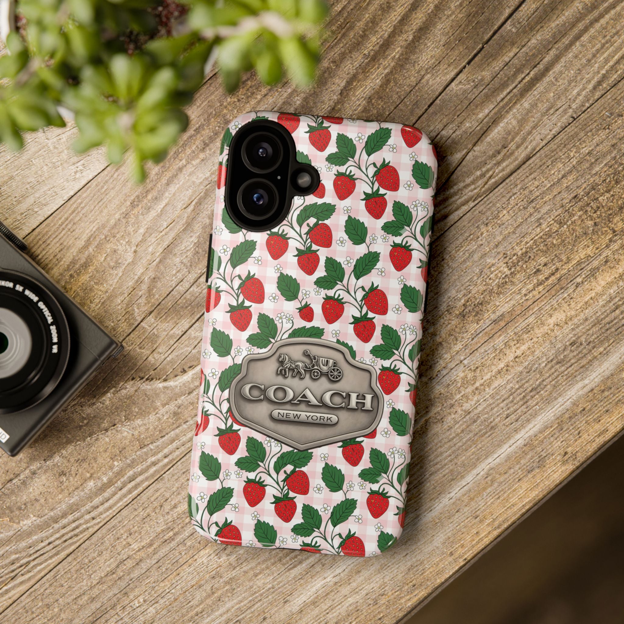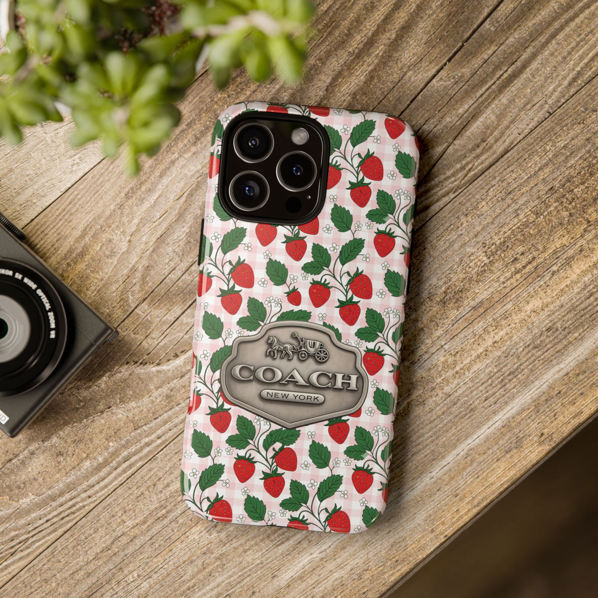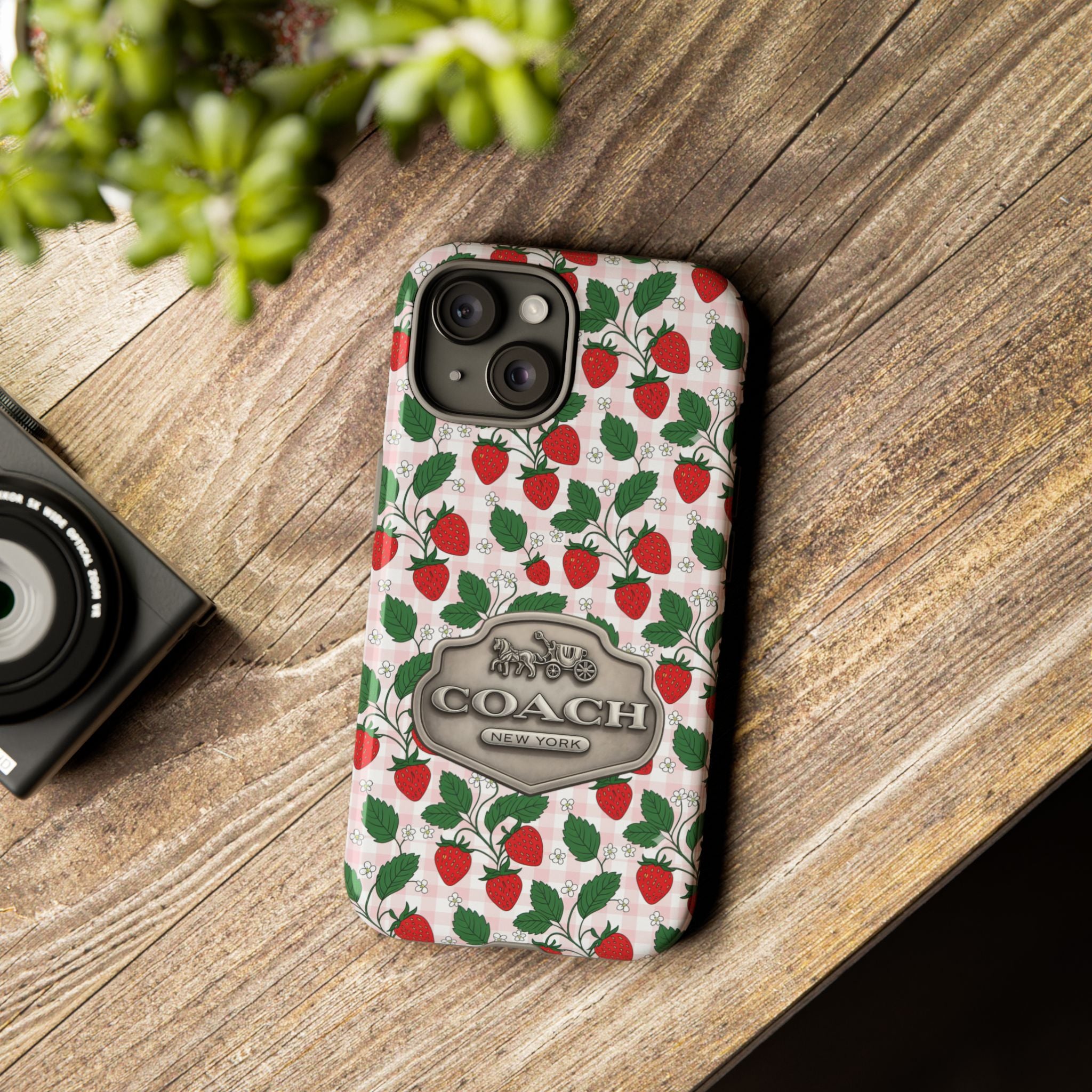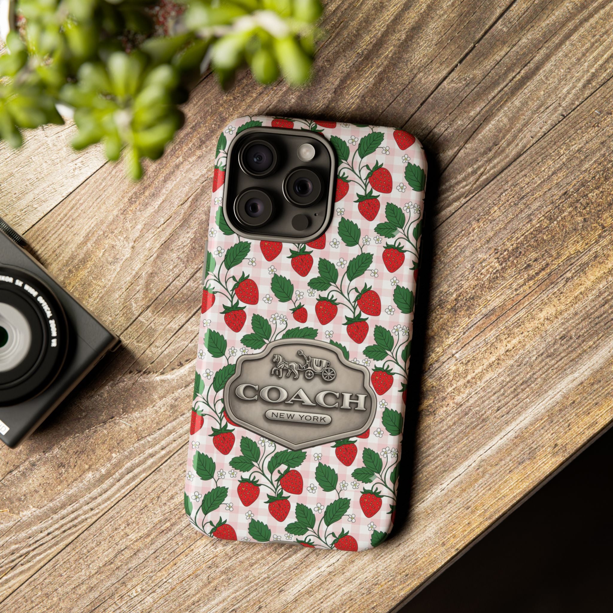 Strawberries Pink Gingham Phone Case, Tough Cases, Coach Inspired Cute Floral Design, Gift for Her, Spring Accessory, Chic Tech Gear