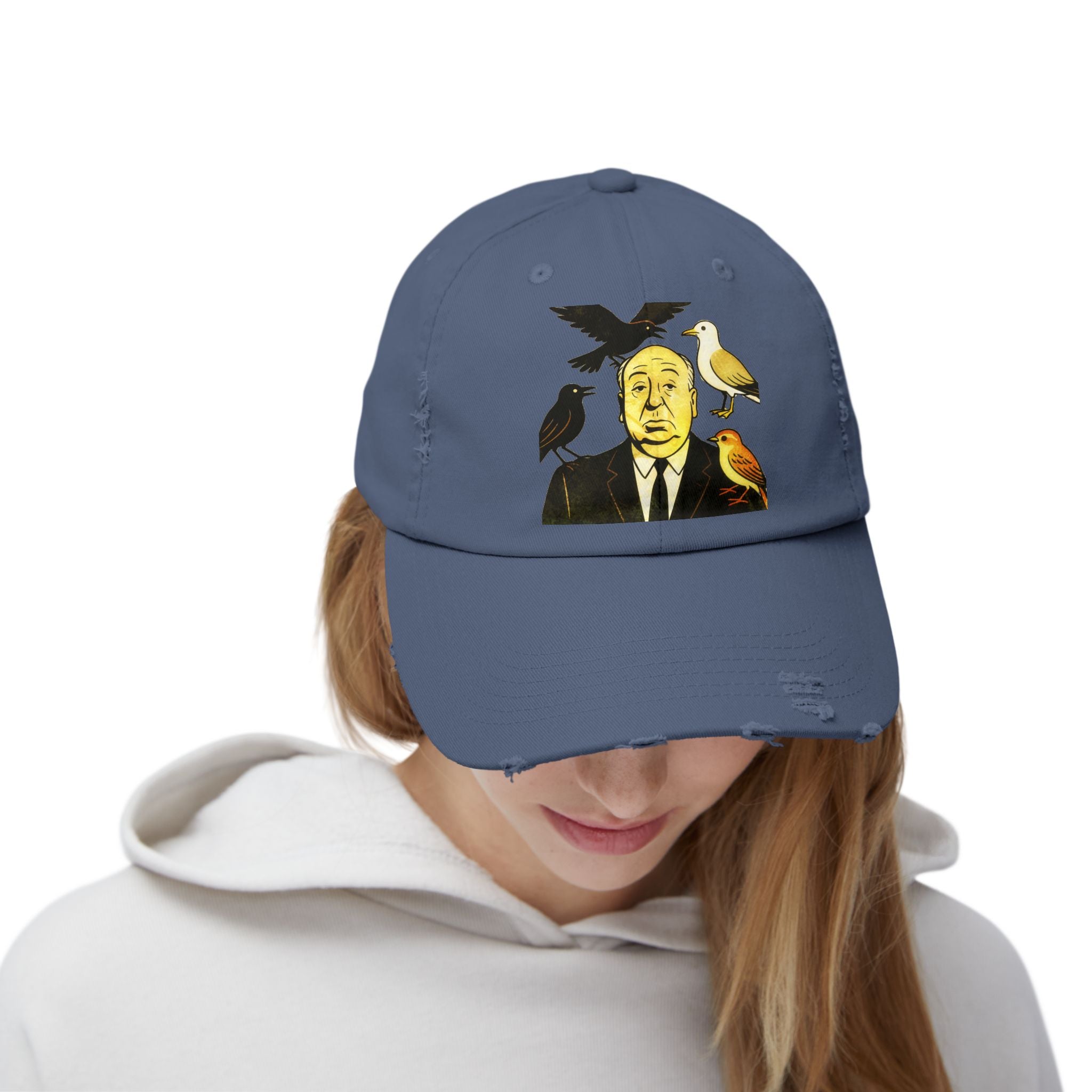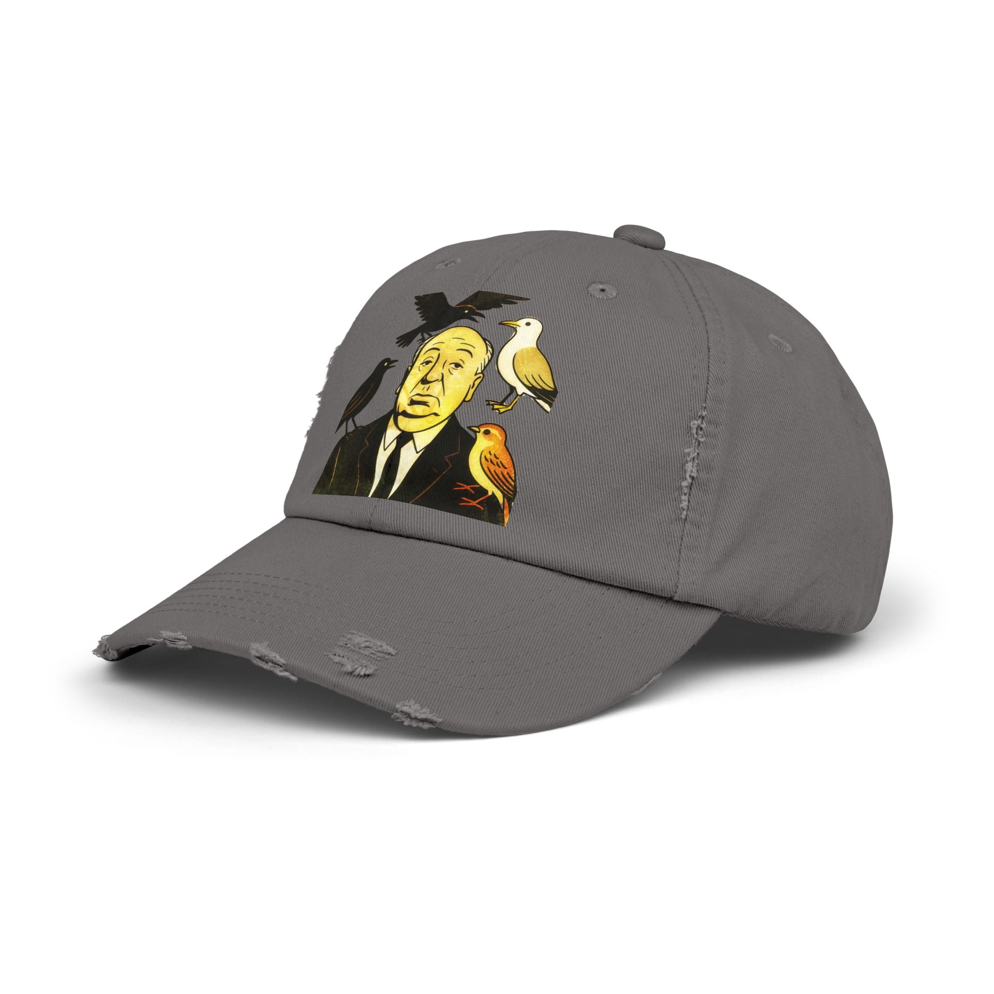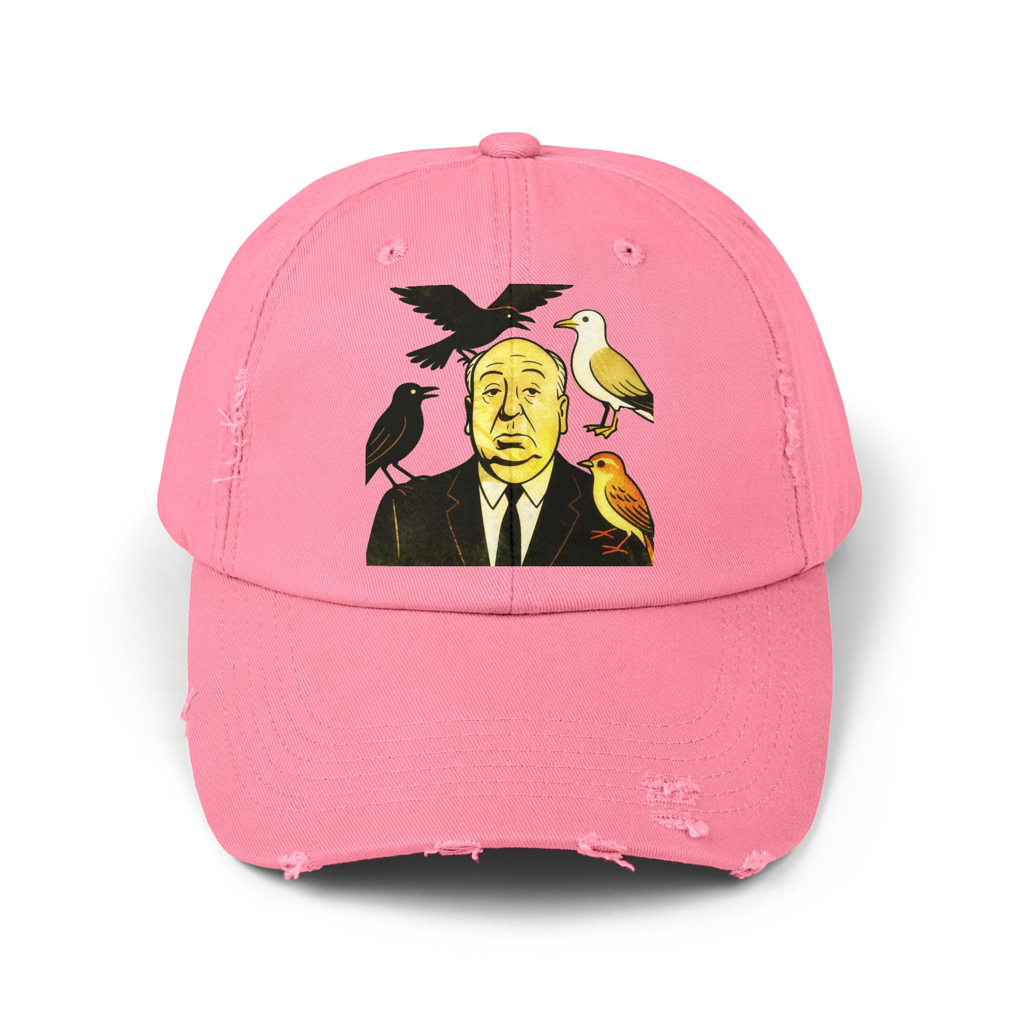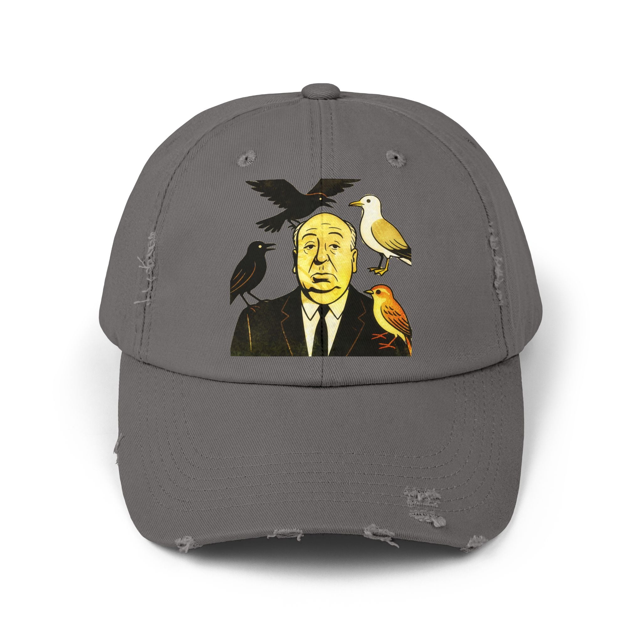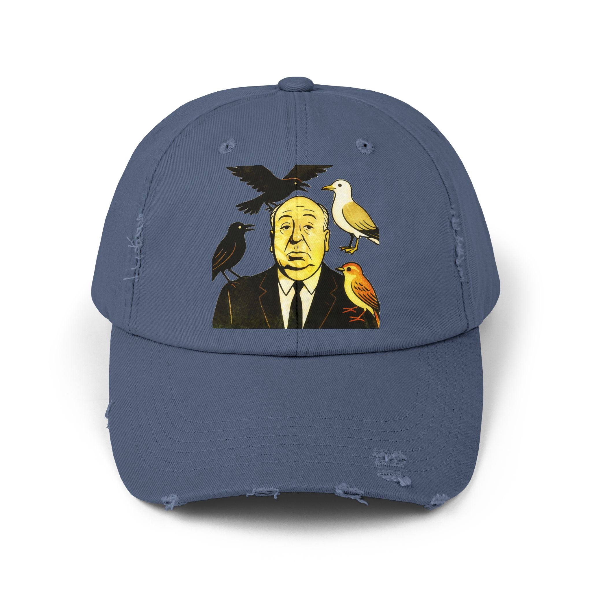 Vintage-Inspired Distressed Cap with Iconic Alfred Hitchcock- The Bird Design, Casual Accessories, Unique Gift for Movie Lovers, Stylish Everyday Wear