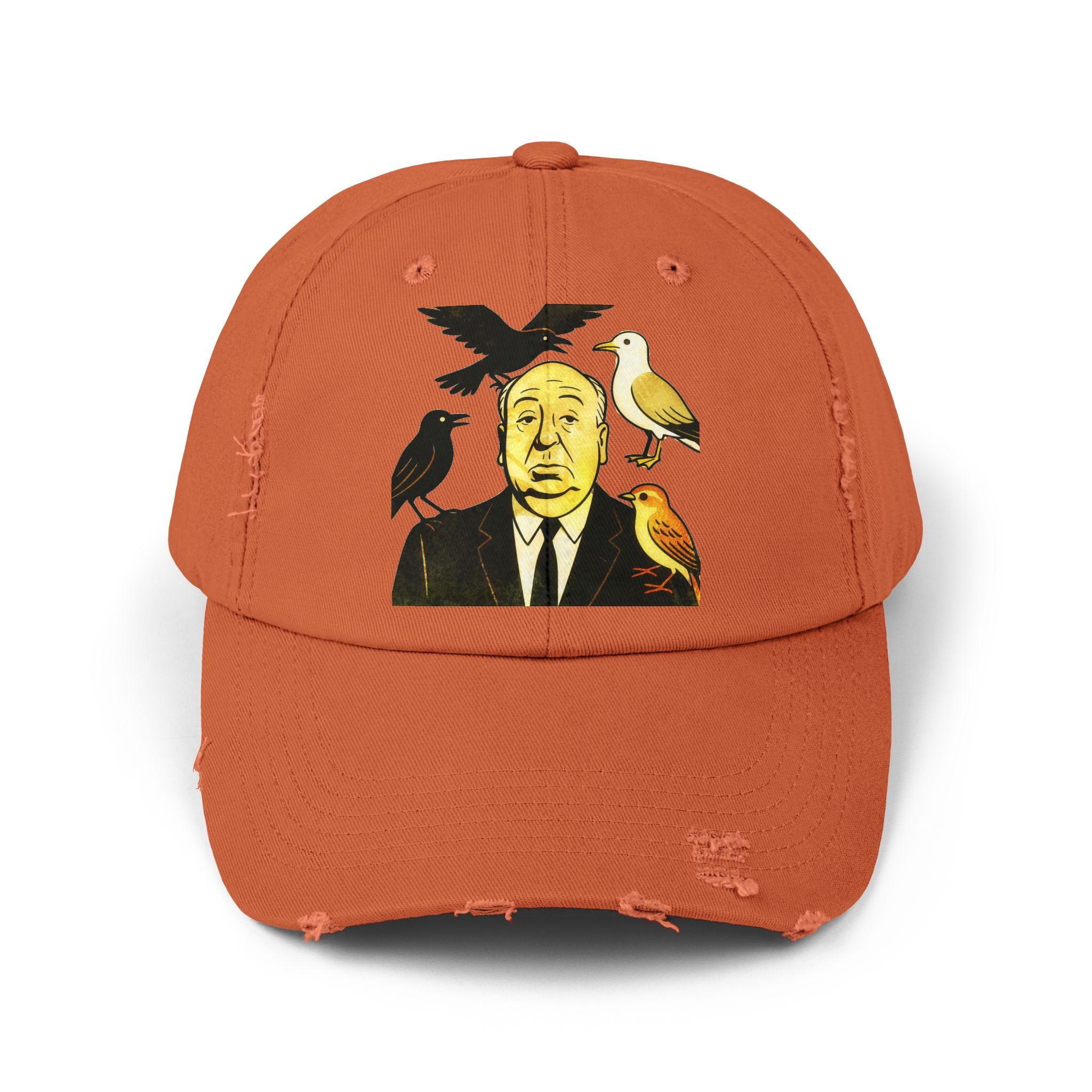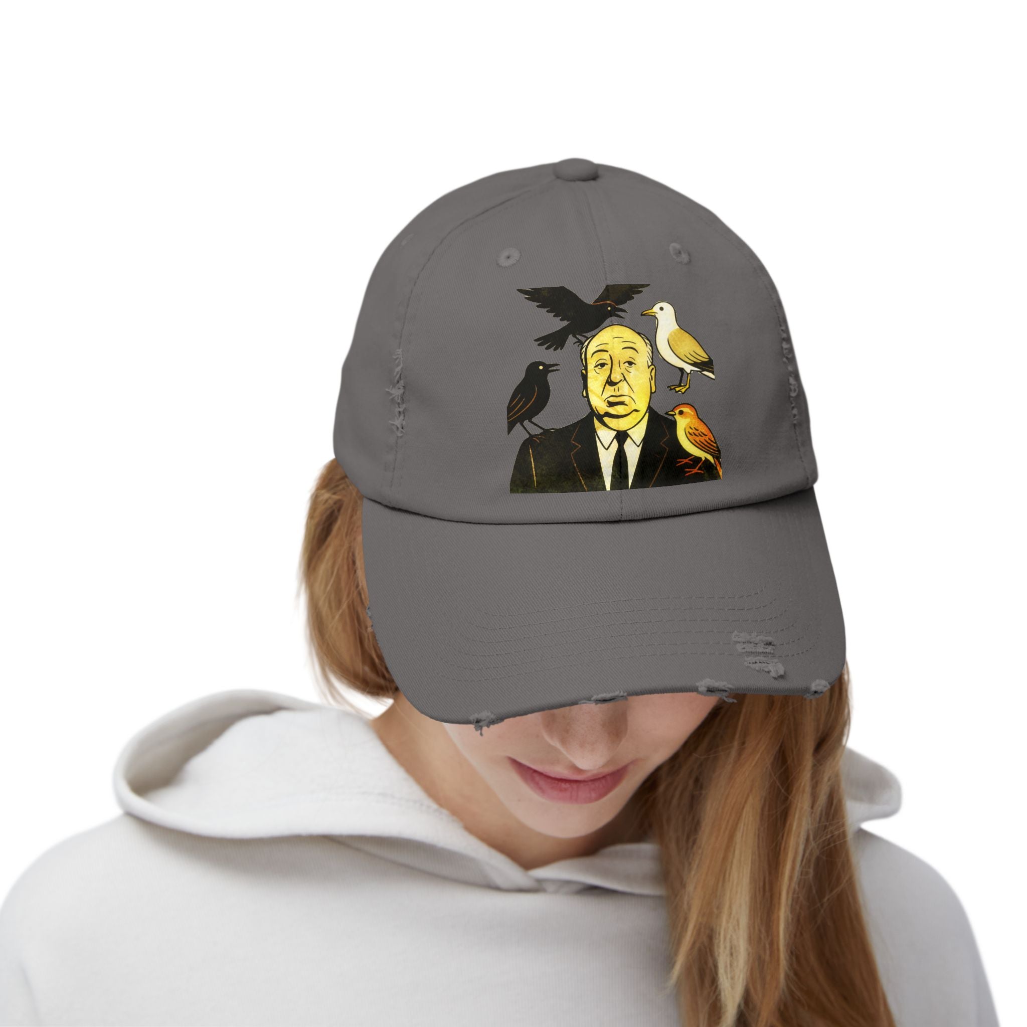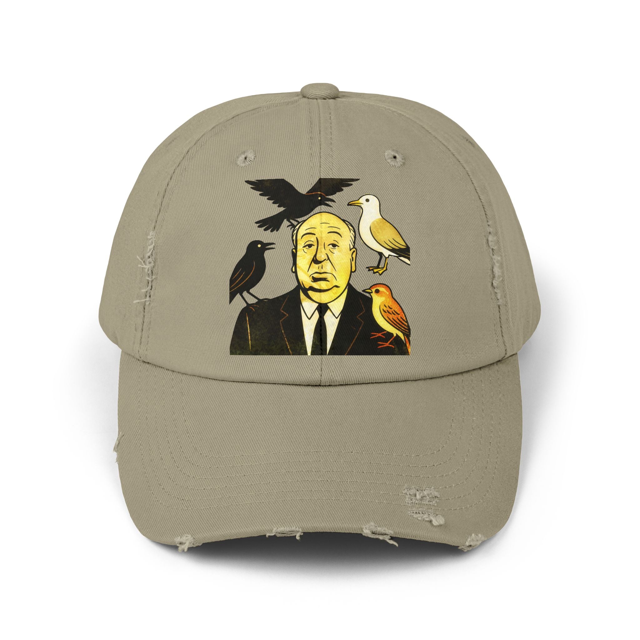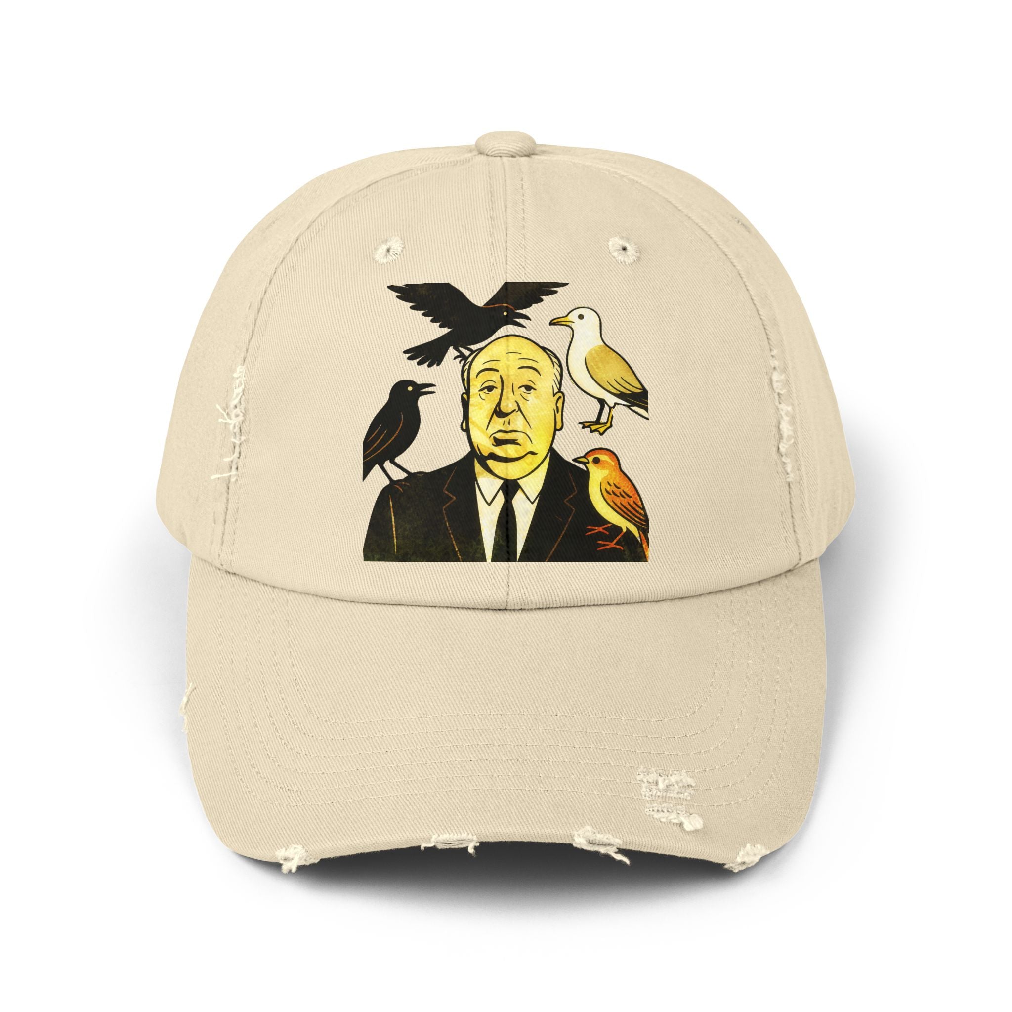 Vintage-Inspired Distressed Cap with Iconic Alfred Hitchcock- The Bird Design, Casual Accessories, Unique Gift for Movie Lovers, Stylish Everyday Wear