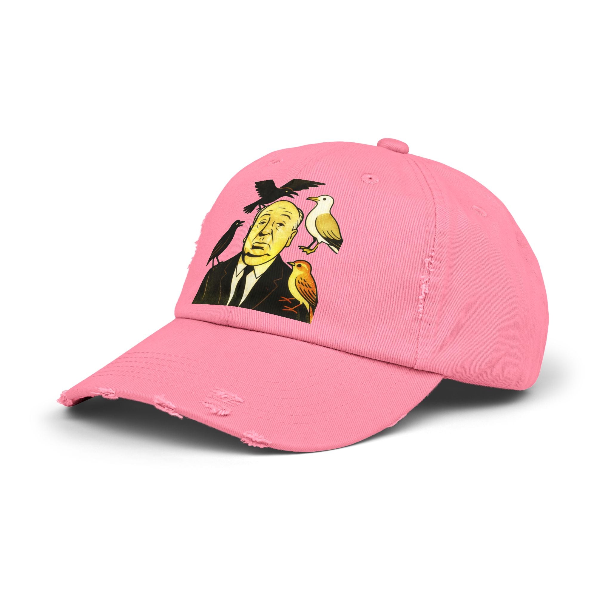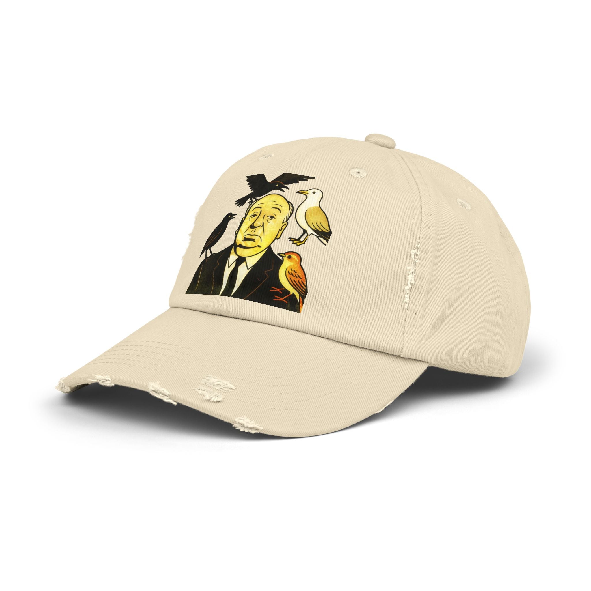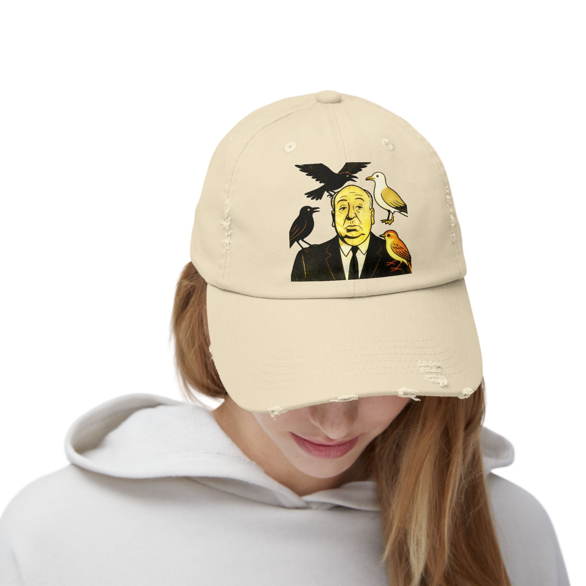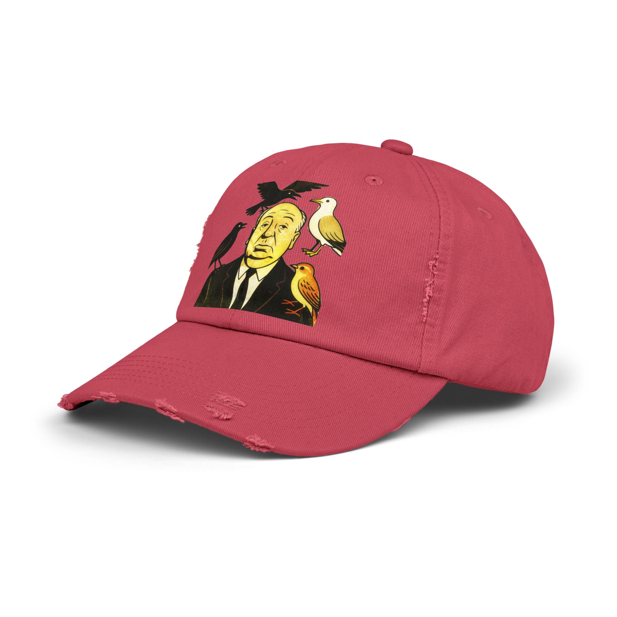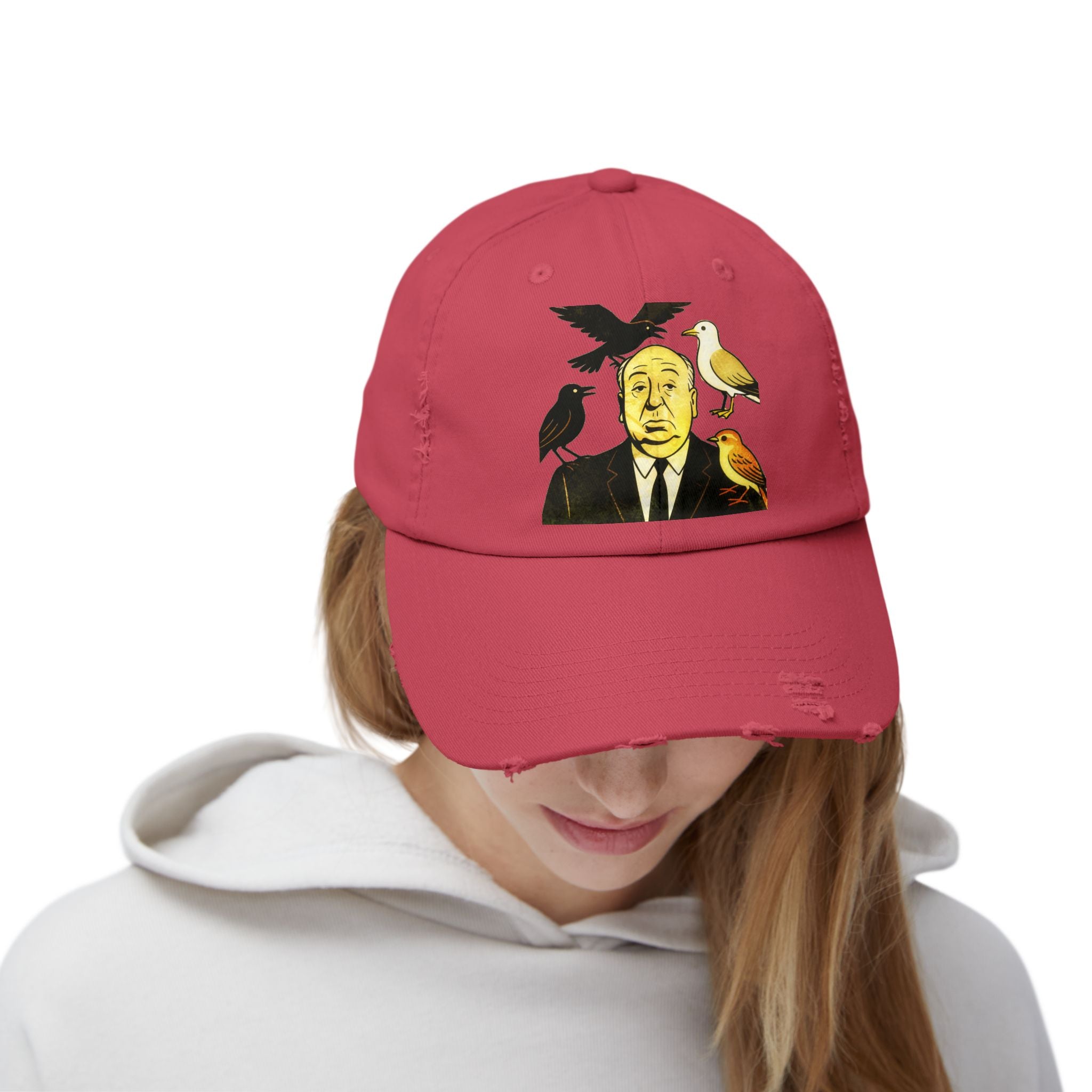 Vintage-Inspired Distressed Cap with Iconic Alfred Hitchcock- The Bird Design, Casual Accessories, Unique Gift for Movie Lovers, Stylish Everyday Wear