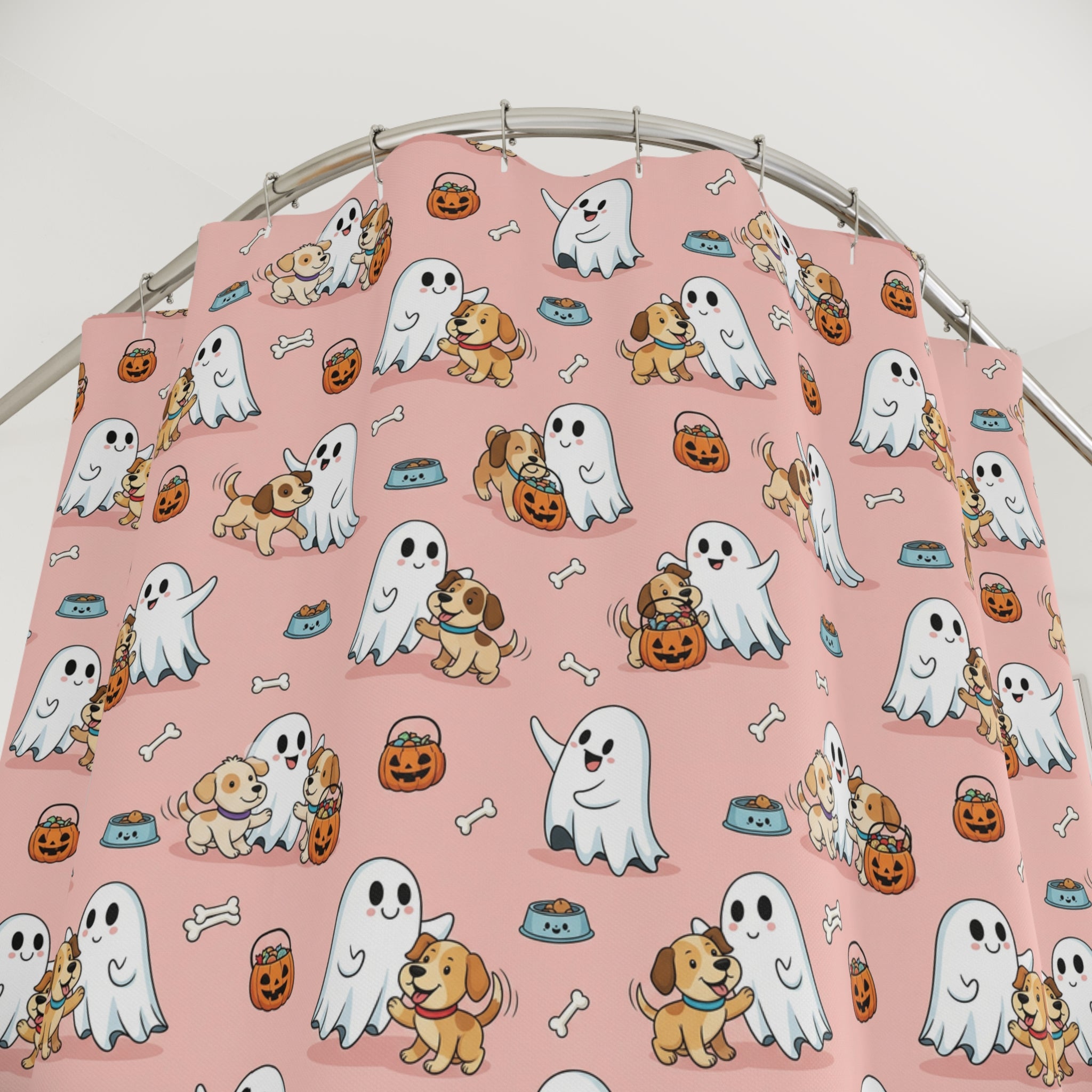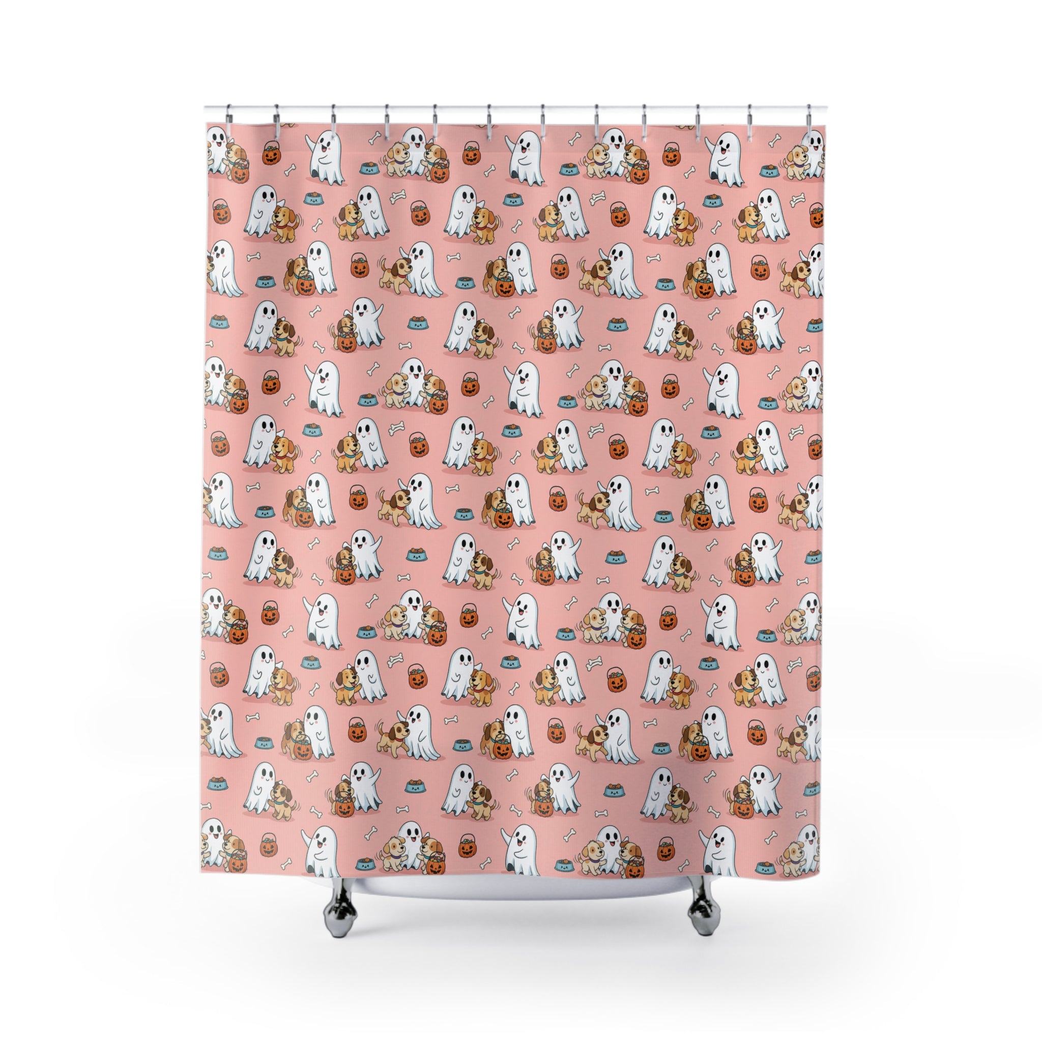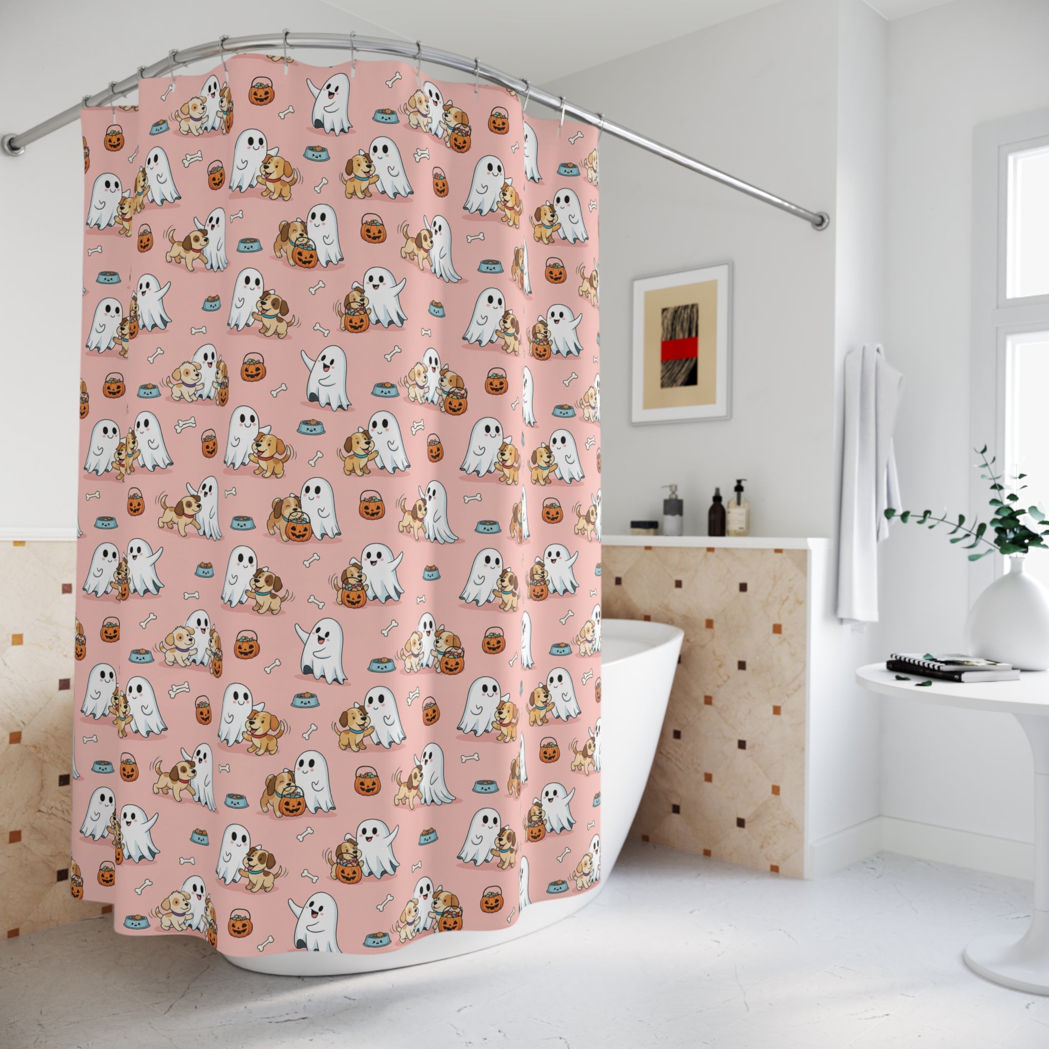 Whimsical Ghost & Puppy Shower Curtains – Cute Bathroom Decor, Halloween, Pet Lovers, Gift Idea, Playful Design